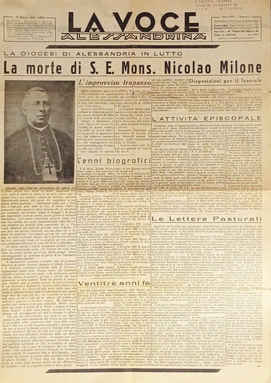 Giornale - La Voce Alessandrina N. 6 - 1945 Morte di S. E. Mons. Nicolao Milone