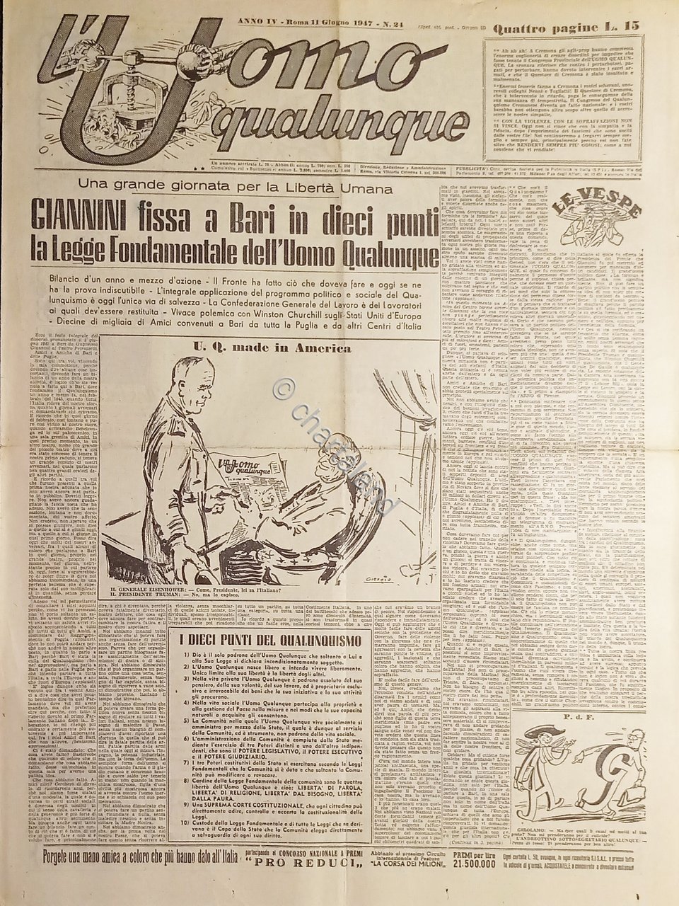 Giornale di G. Giannini - L'Uomo qualunque N. 24 - U. Q. made in America - 1947