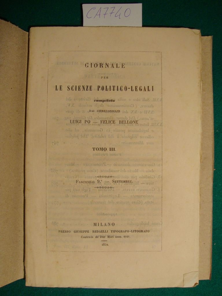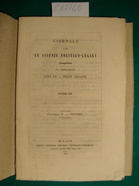 Giornale per le scienze politico-legali compilato dai giureconsulti Luigi Po - Felice Bellone - Tomo III - Fascicolo 9° - Settembre | Libri antichi e moderni | Po Luigi - Bellone Felice