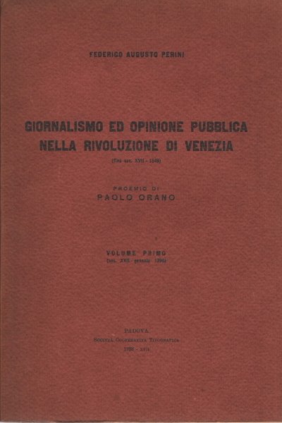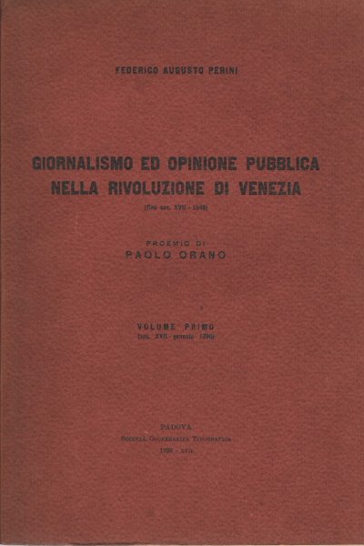 Giornalismo ed opinione pubblica nella rivoluzione di Venezia (fine secolo XVII - 1849), volume 1 | Libri antichi e moderni | Federico Augusto Perini