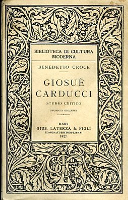 In-8°, pp. (8), 155, brossura editoriale con titolo inquadrato da bordura a motivi fitomorfi impressi in bianco su fondo nero. Una firma a matita. Buon esemplare. Seconda edizione in raccolta di questi saggi crociani sul Carducci, poeta del cuore del grande filosofo, che, nella sua giovinezza, si era nutrito degli ideali cantati nella lirica carducciana (Croce seguitò a ritenere Carducci 'l'ultimo grande poeta d'Italia'): Anticarduccianismo postumo; Le varie tendenze, e le armonie e disarmonie di Giosuè Carducci; Lo svolgimento della poesia carducciana; Il Carducci pensatore e critico. Gli scritti erano già apparsi su 'La Critica' e poi nella 'Letteratura della nuova Italia'. Biblioteca di Cultura Moderna.