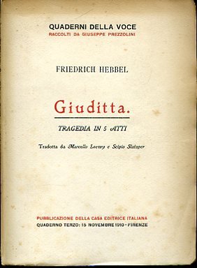 In-16° grande, pp. 109, brossura editoriale con titolo in rosso e nero. Perfetto esemplare entro velina. Prima edizione italiana, nella traduzione di Scipio Slataper (che di Hebbel fu appassionato studioso) e di Marcello Loewy, di uno dei capolavori del teatro romantico tedesco, tipico frutto dello 'Sturm und Drang'. Hebbel scrisse la tragedia nel 1839 dopo essere stato folgorato dalla visione di un quadro di Giulio Romano raffigurante Giuditta e Oloferne nella Pinacoteca di Monaco di Baviera. Quaderni della Voce raccolti da Giuseppe Prezzolini.