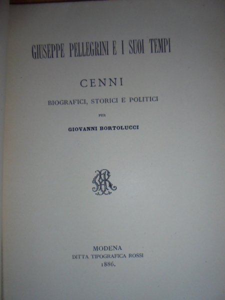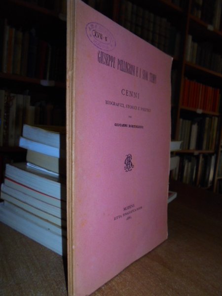 BORTOLUCCI, Giovanni - Modena, tip. Rossi, 1886. Giuseppe Pellegrini e i suoi tempi. Cenni biografici e politici. In-8°, br., cop. orig. 80 pp. Intonso. Dedica nella prima bianca. In ottimo stato di conservazione. Neg. mob. 1