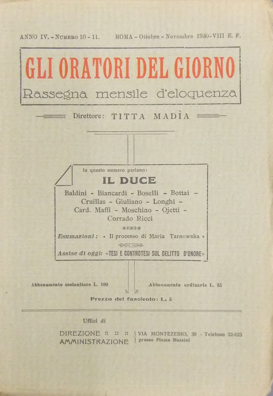 Gli oratori del giorno. Rassegna mensile d'eloquenza. Anno IV - Numero 10-11. Ottobre-Novembre 1930 | Libri antichi e moderni | Bottai G. - Trozzi M. Et Alii