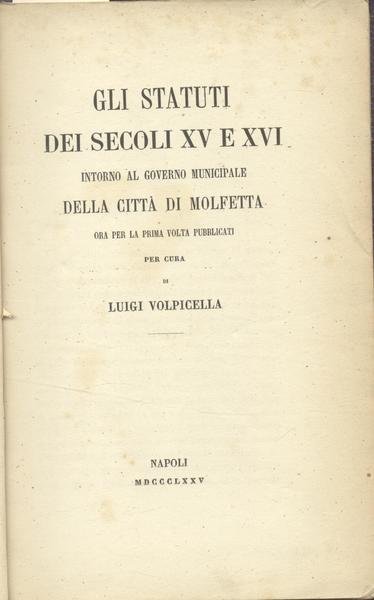 GLI STATUTI DEI SECOLI XV E XVI INTORNO AL GOVERNO MUNICIPALE DELLA CITTA' DI MOLFETTA. Ora per la prima volta pubblicati per cura di Luigi Volpicella.