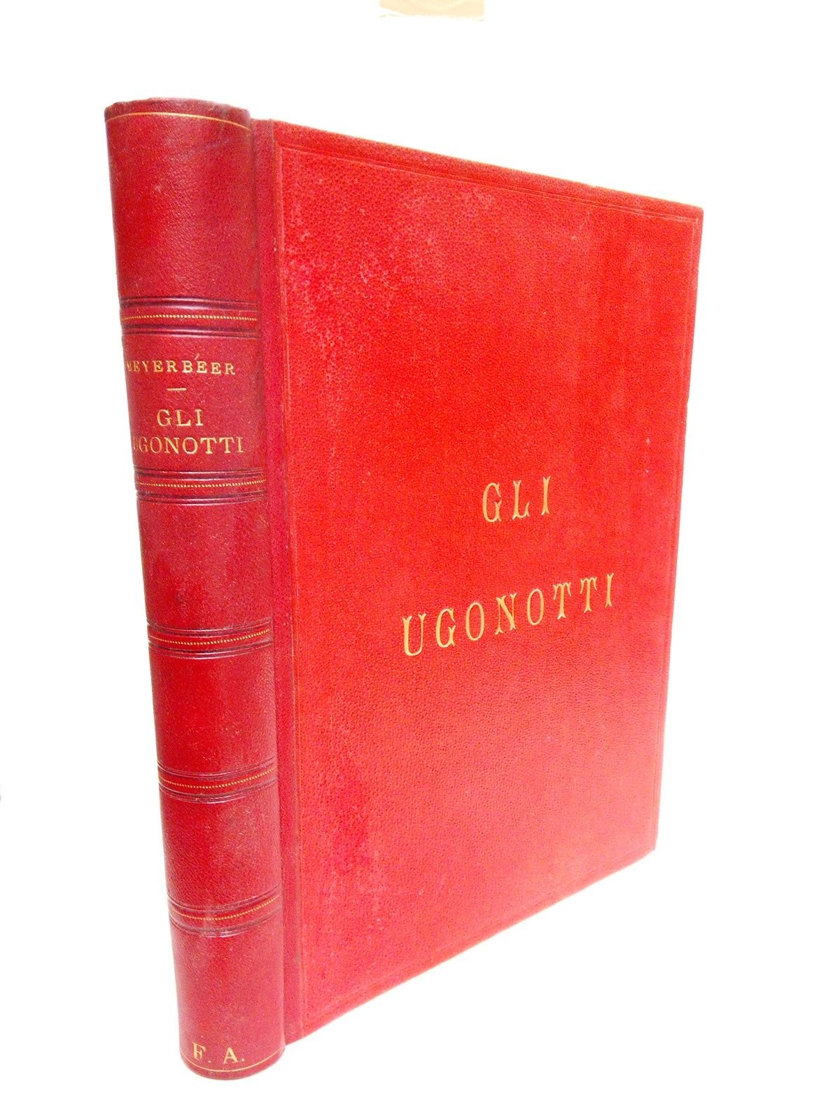 Milano: R. Stablimento Ricordi, [s.a., ca. 1885].- 23 p. del libreto + 441 p. de partituras musicales con la letra de las canciones en italiano: Tras la portada retrato grabado de Meyerbeer; 4º mayor (28,1 x 21,5 cm); Enc. en Media Piel chagrén, época, lomo dorado, tapa anterior con el título estampado en oro.* La encuadernación con pequeñas rozaduras en el lomo, que han sido restauradas, quedando muy bien. La portada con 2 sellos tampón de antiguas librerías. Por lo demás en perfecto estado. MÚSICA, DANZA, INSTRUMENTOS MUSICALES Y DISCOGRAFÍA