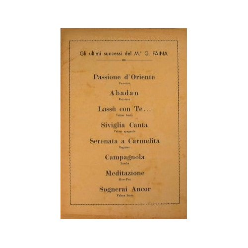 in 8° - pp.47 - Brossura editoriale - Contiene i brani ' Passione d'Oriente ' ( fox trot ), ' Abadan ' ( fox trot ), ' Lassù con te ' ( vazler lento ), ' Siviglia canta ' ( valzer spagnolo ), ' Serenata a Camelita ' ( beguine ), ' Campagnola ' ( Samba ), ' Meditazione ' ( slow fox ) e ' Sognerai Ancor ' ( valzer lento ) - Partitura per Pianoforte, Violino/Fisarmonica, Saxofono Contralto, Saxofono Contralto/Clarinetto, Saxofono Tenore, Saxofono Tenore/Clarinetto e Tromba