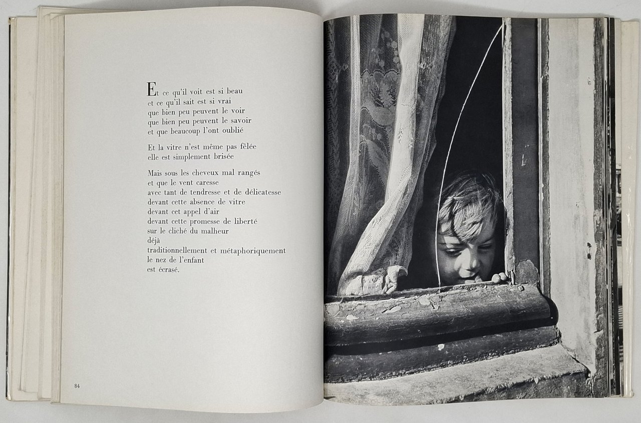 Finito di stampare il 10 novembre 1951. Esemplare numerato (n. 8065). testi del celebre poeta (e sceneggiatore) francese Jacques Prevert e fotografie in nero di Izis Bidermanas. Lingua del testo: francese. Pagine: 144 + [8]. Formato: 22,5 x 28 cm circa. Stato di conservazione: evidenti e marcati strappi (senza mancanze) sui margini (superiore ed inferiore) della sovraccoperta, piega sulla linguetta interna della sovraccoperta (lato posteriore), una rottura con mancanza di piccole dimensioni (circa 2 cm) sulla prima pagina bianca dove, per altro, è presente anche una piccola firma d'appartenenza a biro ma, interno, ben conservato. In brossura con copertina flessibile muta e sovraccoperta con illustrazione fotografica in nero di Izis Bidermanas (sovraccoperta incollata al dorso del volume).