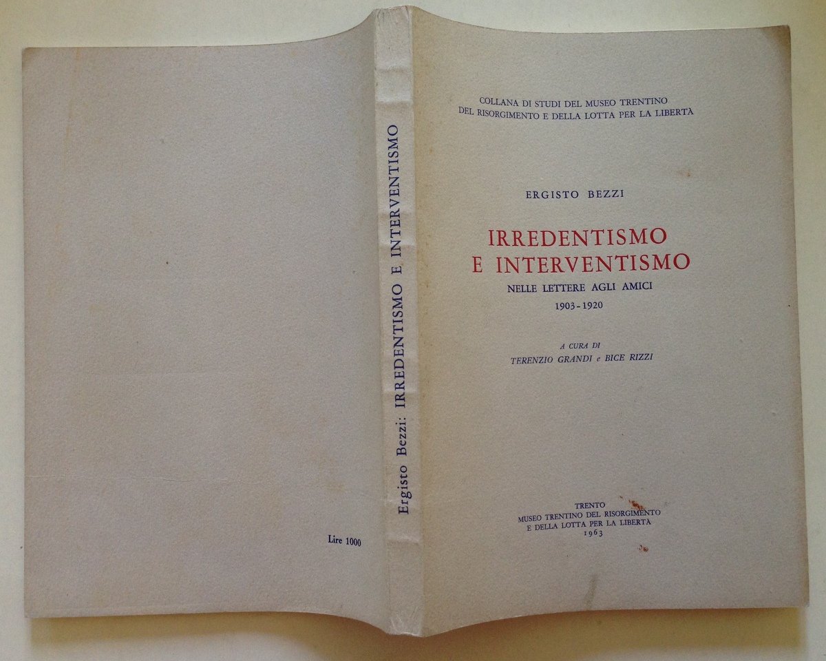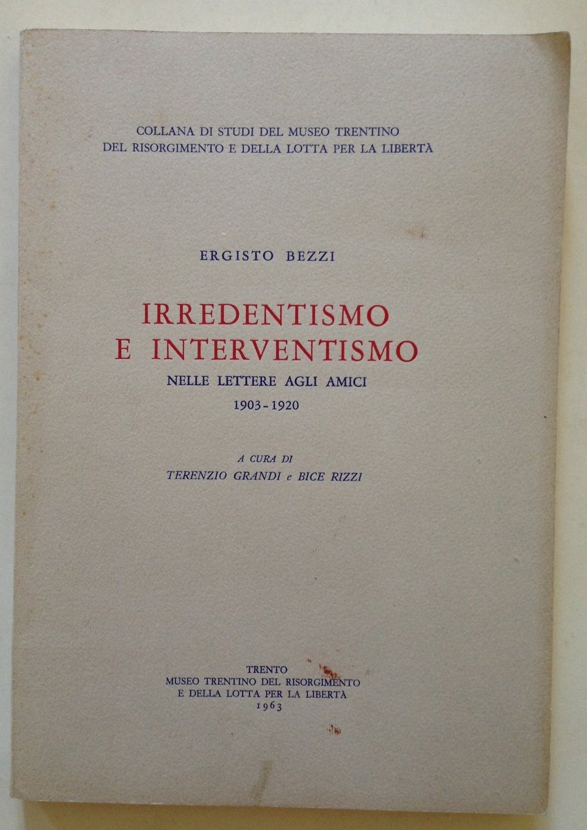 Ergisto Bezzi, Irredentismo e interventismo nelle lettere agli amici 1903-1920 a cura di T. Grandi e B. Rizzi Museo Risorgimento Trento 1963, cm. 24.5x17, pp. 233, br. ed. Condizioni di conservazione Esemplare in buono stato con leggere tracce d'uso; brossura con qualche macchietta. SETT123.L12109 MT