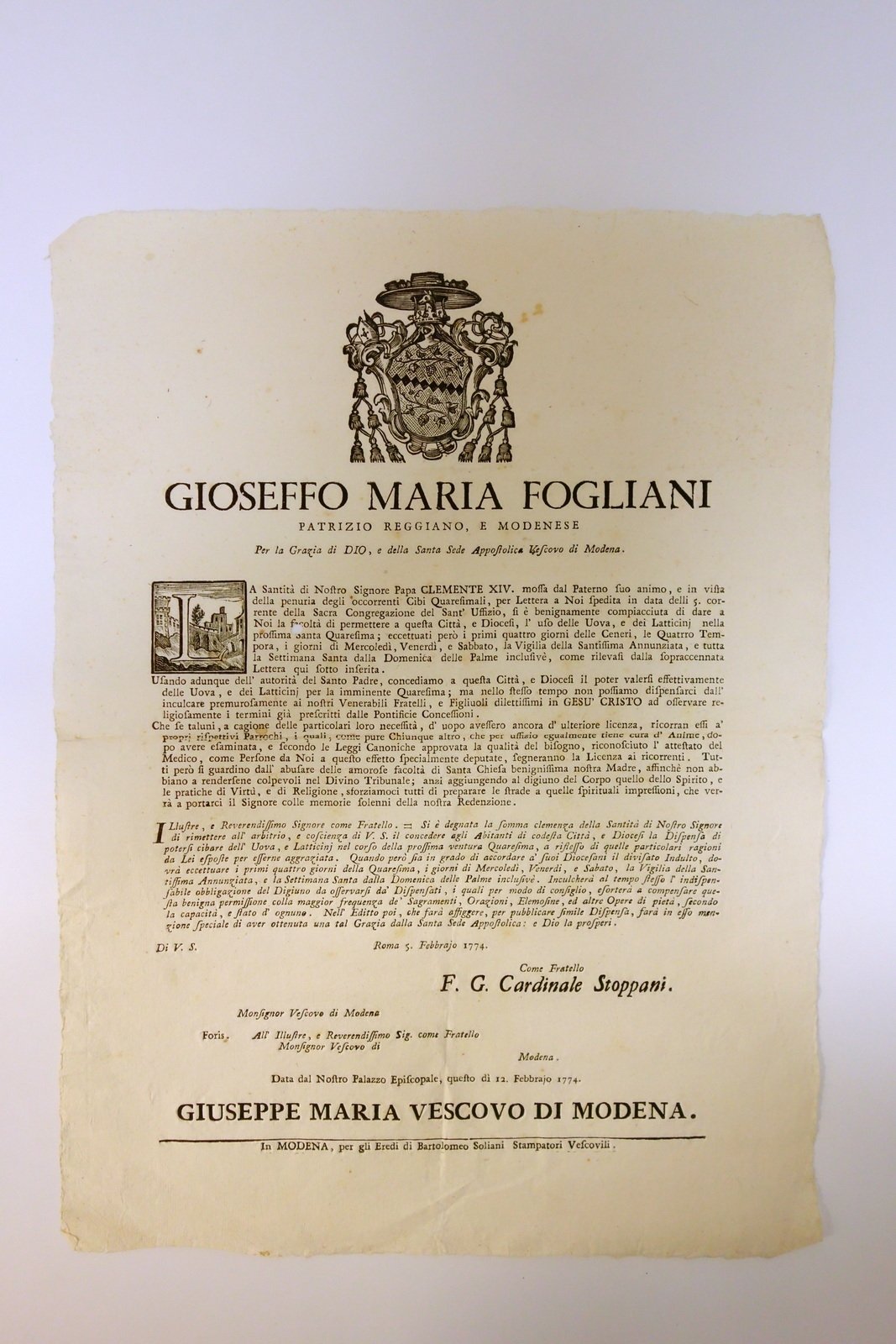 "La Santità di Nostro Signore Papa Clemente XIV, mossa dal Paterno suo animo, e in vista della penuria degli occorrenti cibi quaresimali, per lettera a Noi spedita in data delli 5 corrente della Sacra Congregazione del Sant'Uffizio, si è benignamente compiaciuta di dare a Noi [...] permettere a questa Città, e Diocesi, l'uso delle uova, e dei latticini nella prossima Santa Quaresima [...]"