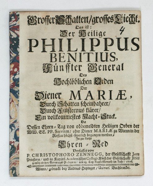 27, (1) SS. Buntpapier-Heftstreifen am Rücken. 4to. Enkomion auf den Hl. Philipp Benizi (1233-85), den fünften Generalsuperior der Serviten. Dieser gilt, nach den sieben heiligen Gründern des Servitenordens, als "zweiter Gründer" und Erneuerer des Ordens, überarbeitete die Ordensregeln und rief den weiblichen Zweig, die Servitinnen ins Leben. - Der aus dem Kärntner Toggenbrunn gebürtige Jesuit Zennegg (1666-1712) lehrte Poesie, Rhetorik und Philosophie; aufgrund seiner besonderen rhetorischen Fertigkeiten wurde er unter Kaiser Joseph I. und Karl VI. zum Hofprediger ernannt (vgl. de Backer/S. VIII, 1488). - Durchgehend etwas gebräunt; am Titel alte hs. Numerierung. - Nicht bei de Backer/Sommervogel. Zu Heyinger vgl. Durstmüller I, 120.