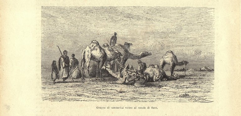 Gruppo di cammellai vicino al canale di Suez. Stampa 1863.