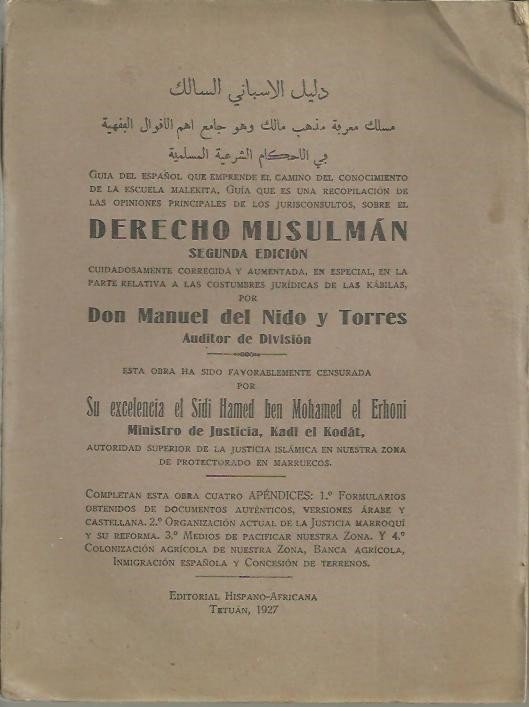 GUIA DEL ESPAÑOL QUE EMPRENDE EL CAMINO DEL CONOCIMIENTO DE LA ESCUELA MALEKITA, Y CUYA GUIA ES UNA RECOPILACION DE LAS OPINIONES PRINCIPALES DE LOS JURISCONSULTOS, SOBRE EL DERECHO MUSULMAN.