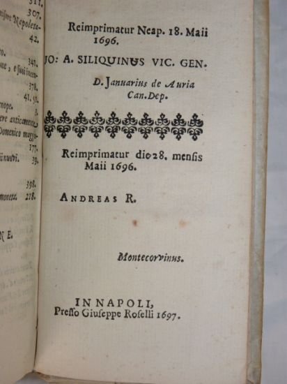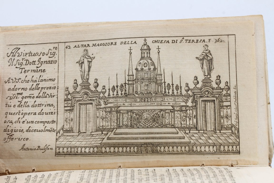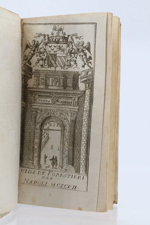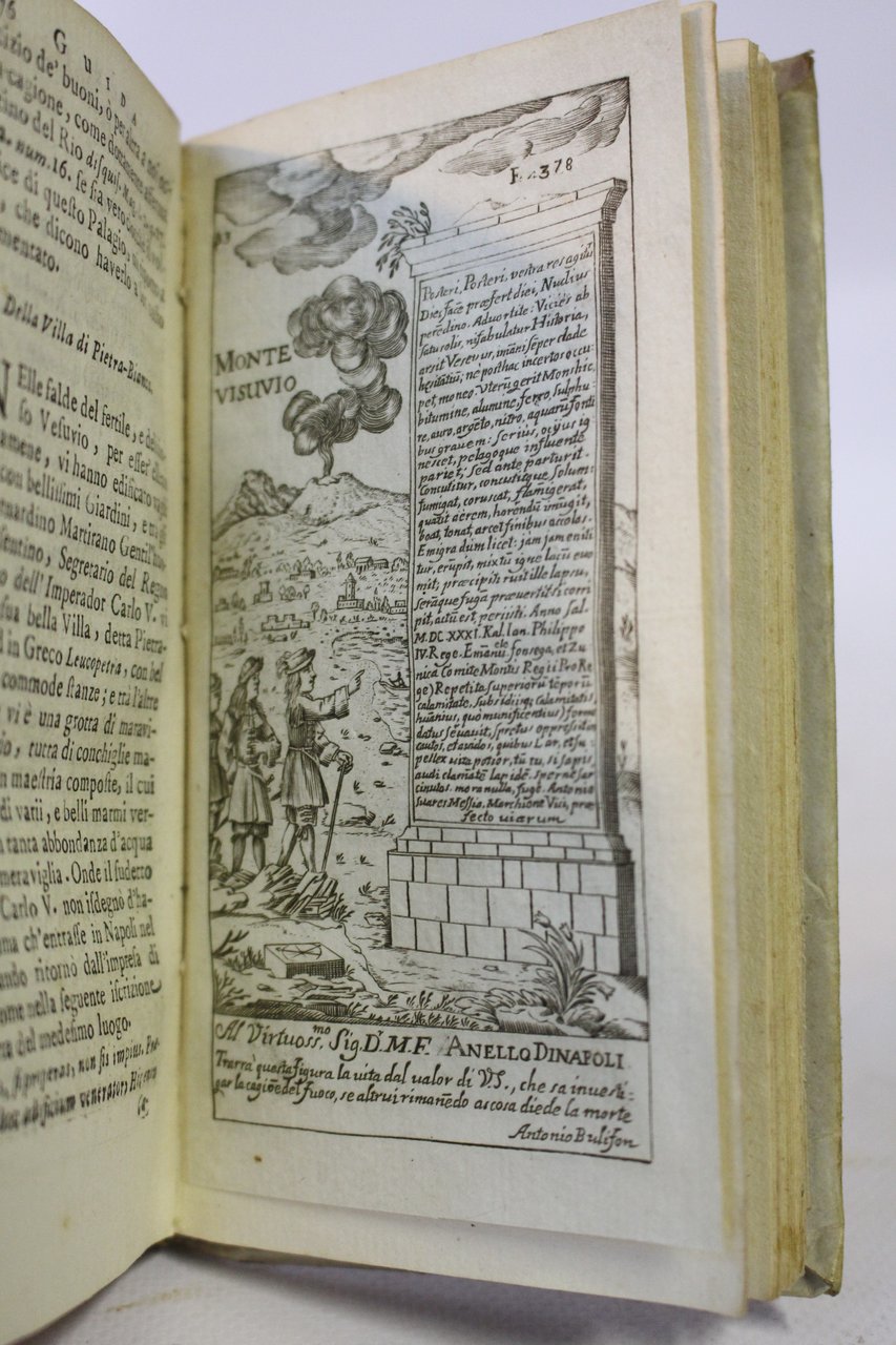 presso Giuseppe Roselli | in Napoli [Naples] 1697 | 8.50 x 15.20 cm | relié | [ENGLISH DESCRIPTION ON DEMAND] | Nouvelle édition augmentée et révisée après l'originale de 1685. Editée par Antonio Bulifon. Illustré de une carte dépliante de Naples, un frontispice, et 49 figures hors texte, dont le format est légèrement plus petit que l'ouvrage et sur une papier différent, plus fin. Outre les églises, les monuments, fontaines et trésors, on y voit une planche du Vésuve et une du port. Toutes les planches portent une légende se terminant par le nom Antonio Bulifon. Cet excellent guide de Naples a été édité jusqu'au XIXe. Reliure en plein vélin souple d'époque. Dos lisse avec titre à la plume. Une mince déchirure à la carte. Ce guide des étrangers (Forestieri) recense et décrit tous les monuments et les bâtisses remarquables de Naples ainsi que les oeuvres qu'ils renferment. En index, un catalogue des églises de Naples. On a appelé Naples la ville aux mille églises, il y eut par ailleurs de très nombreuses constructions au XVIIe. Pompeo Sarnelli (1649-1724) fut évêque et écrivain, on lui doit un autre guide de la région de Naples et des contes napolitains, issus de la tradition orale.