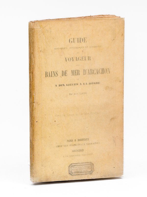 Orné de cartes et de vues diverses, 1 vol. in-12 br., Chez les Principaux Libraires, Paris & Bordeaux, A la Librairie Nouvelle, Arcachon, 1856, 118 pp. avec 2 cartes dépliantes Rare exemplaire du tout premier guide consacré aux bains de mer sur le Bassin d'Arcachon. L'exemplaire décrit par la BNF indique 2 volumes dont un atlas avec cartes et vues. Notre exemplaire contient deux cartes dépliantes, mais aucune autre planche hors texte (alors même que la page de titre évoque la présence de "Vues diverses". Poète français et occitan, Jean Lacou (1820-1908) est l'auteur d'une oeuvre littéraire variée ; issu d'un milieu très modeste, il fut également un journaliste intéressé aux problèmes sociaux, mais également un inventeur revendiquant 21 inventions. Etat satisfaisant (sans les vues annoncées, papier cristal postérieur protégeant la couverture contrecollé en dos, bon état par aileurs) pour cet ouvrage de toute rareté.