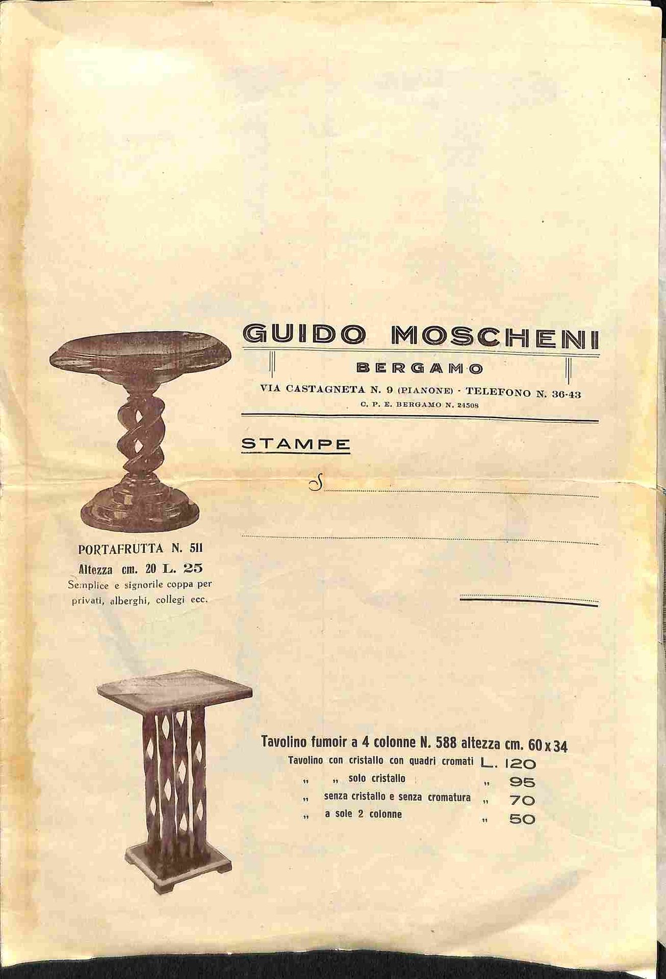 Pieghevole di 6 facciate (ciascuna facciata misura cm 21,5 x 31 circa), gora e alone rossastro ai fogli, piccolo foro alla facciata posteriore. Conservati all'interno due fogli di carta velina. Pieghevole e fogli pubblicitari dei torciglioni Moscheni, strutture piedistallo in legno, supporti per tavolini, portavaso, portafiori, lampadari, colonne, ecc. Non datato ma 1935 circa.