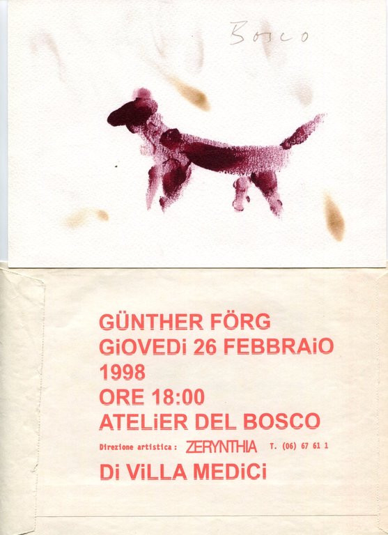 Cartoncino d'invito alla mostra di Gunther Forg presso l'Atelier del Bosco di Villa Medici, Roma, 26 febbraio - 19 aprile 1998. Direzione artistica del ciclo "L'atelier del Bosco" di Zerynthia. Al verso un'illustrazione a colori dell'artista. Sulla busta l'invito all'inaugurazione (giovedì 26 febbraio 1998) . Cm 15x21 (busta 16x24 cm). . . Molto buono (Very Good). . . . L'associazione per l'arte Contemporanea Zerynthia, con il progetto "L'atelier del Bosco", ha voluto aprire gli spazi dell'Accademia di Francia, in Trinità dei Monti, alla città di Roma con un programma che ha visto esporre 13 artisti accumunati dall'amore per questa città. Le esposizioni hanno avuto come protagonisti: Carla Accardi, Jannis Kounellis, Gunther Forg, Michelangelo Pistoletto, Karel Appel, Joseph Kosuth, Vettor Pisani, Ettore Spalletti, Thierry De Cordier, Franz West, Giovanni Anselmo, Sol LeWitt, Giulio Paolini. Le mostre si sono succedute da dicembre 1997 a giugno 2002