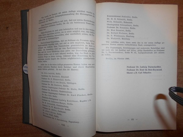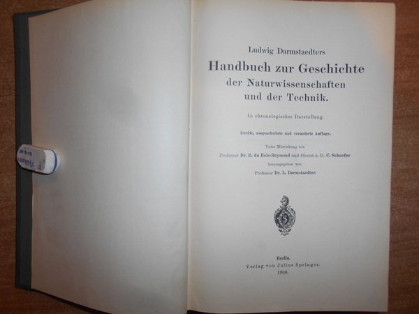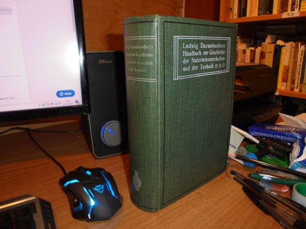 LUDWIG DARMSTAEDTERS. Berlin, Verlag von Julius Springer, 1908. HANDBUCH zur GESCHICHTE der NATURWISSENSCHAFTEN und der Technik. In chronologischer Darstellung. Zwelte, umgearbeitete und vermehrte Auflage. In-8°, tela edit. con titoli sul piano e al dorso. X, 1262, (1) pp. Ottimo esemplare. Uff. D - III - 2