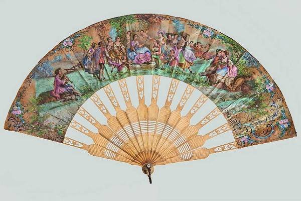 14-rod rack of ornamentally decorated open-work bone. Coating colours on silk, figural and ornamental motifs, backed with paper. C. 27 cm. Decorative neo-rococo silk fan, in imitation of the models produced in the late 18th century, integrating the pastoral themes popular in that age: a noble party within a idyllic setting, with a courtship scene providing the central motif, framed by floral garlands in the rococo style. - Occasional tiny tears to silk folds; some slight browning; traces of glue on reverse of the rack, some of the paper backing defective. The rods are very wide near the lower end, with grid-like apertures, while the upper end is narrow and shows floral decorations.