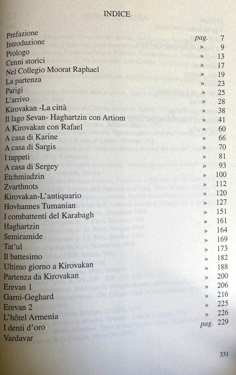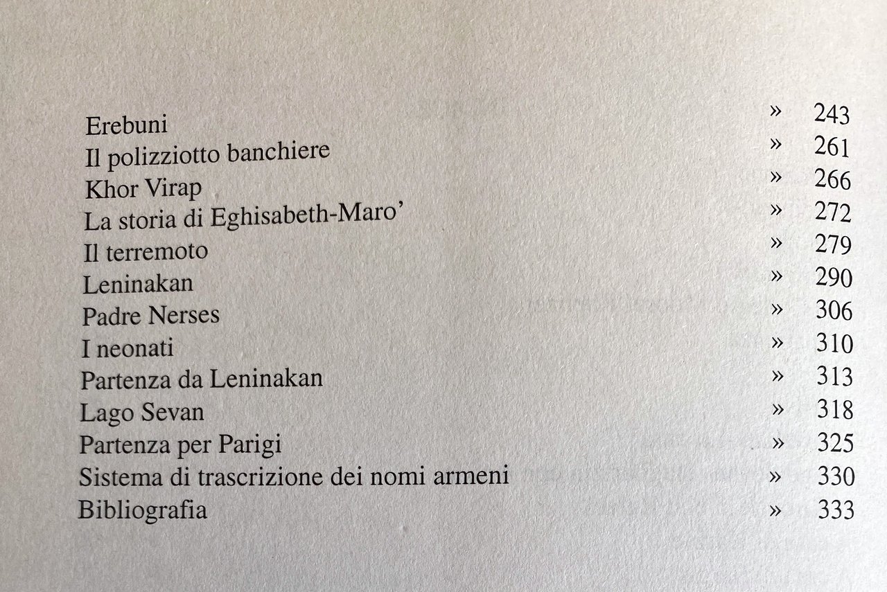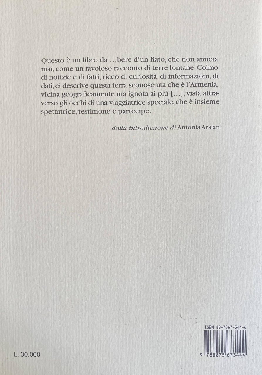 Soggetti: Reportage Viaggio Repubbliche sovietiche Armenia Armeni Diario Resoconti Storia contemporanea Popoli Epopea Persecuzioni Esilio Comunità armene Oppressione Regime sovietico Mosca Russia Franz Werfel Quaranta giorni del Mussa Dagh Turchia Genocidio Sterminio 1915 Olocausto Deportazione Fuga Milioni Cristiani Vittime Guerre Massacri Hayrenig Carlo Polgrossi Levon Zekiyan Aleramo Hermet Calamità naturali Collegio Padri mekhitaristi San Lazzaro Venezia Cronache Vita Usi e costumi Stranieri Memoria Grande Male Giovani Turchi Violenza Radici Superstiti Sopravvivenza Unione Sovietica Etnie Diaspora Testimonianze Conversione Cristianesimo Regno medioevale Ani Città Chiesa Svizzera del Caucaso Leggende Racconti orali Paesaggio Acqua Elettricità razionata Ospitalità Cibo Ricette Riti Tradizione Matagh Libri illustrati rari fuori catalogo Anatolia Kurdi Lingua Cultura Lago Svan Territorio Terremoto Bibliografia Riferimento Studi culturali Storie vere Kirovakan Karabagh Erevan Pane Garni Vardavar Corrispondenti esteri Nouvelles d'Armenie Magazine Letteratura Biografie Memorie Luoghi Abitanti Alaverdi Amici Arayk Azerbaigian Azeri Bambini Candele Canti Casa Erebuni Etchmiadzin Famiglia Georgia Guerra Khatchkar Khor Virap Lavash Lavoro Leninakan Luce elettrica Mangiare Matenadaran Monasteri Montagne Monte Ararat Morti Paese Pietra Ragazzi Rubli russi Sanahin Sargis Sayat Nova Tappeti Tbilisi Tumanian Vardanush Vazken Villaggio Kololak Khaplama Tolma Basturma Tonyr Pulizia etnica Ives Ternon Geghard Nagorno Yerevan Reportage Travel Soviet Republics Union Armenians Diary Reports Contemporary history Peoples Epic Persecutions Exile Armenian communities Oppression Moscow Turkey Genocide Extermination Holocaust Deportation Escape Millions Christians Victims Wars Massacres Natural disasters College Chronicles Life Customs and traditions Foreigners Memory Great Evil Young Turks Violence Roots Survivors Survival Groups Testimonies Conversion Christianity Medieval Kingdom City Church Switzerland of the Caucasus Legends Oral stories Landscape Water Rationed electricity Hospitality Food Recipes Rites Tradition Rare illustrated books out of print Kurds Language Culture Lake Territory Earthquake Bibliography Reference Cultural studies True Bread Foreign correspondents Literature Biographies Memories Places Inhabitants Friends Azerbaijan Azeris Children Candles Songs Home Family War Work Electric light Eating Monasteries Mountains Mount Ararat Deaths Country Stone Boys Russian rubles Village Cleaning ethnic Die vierzig Tage des Musa Dagh
