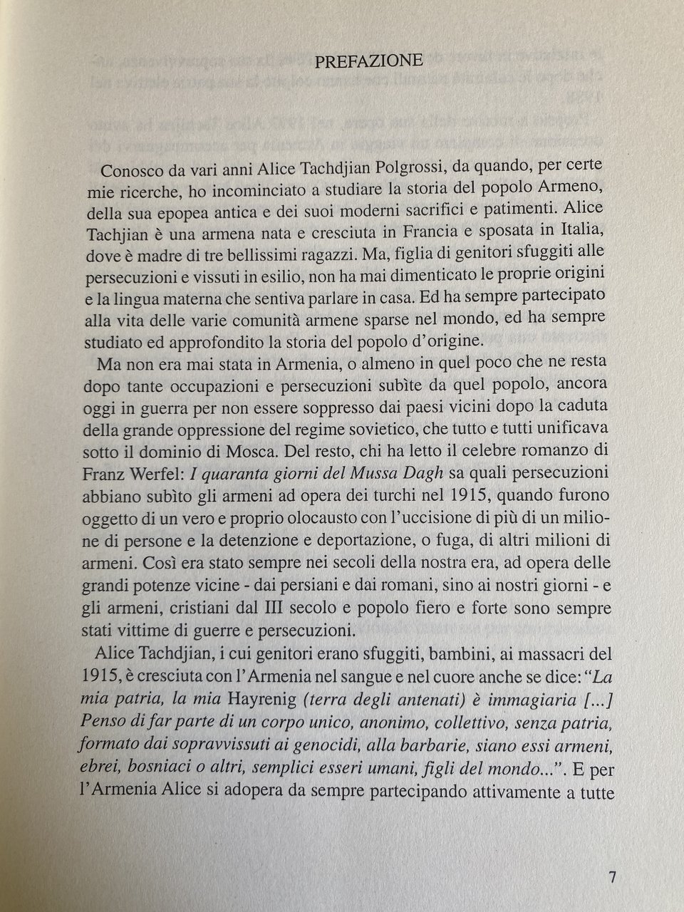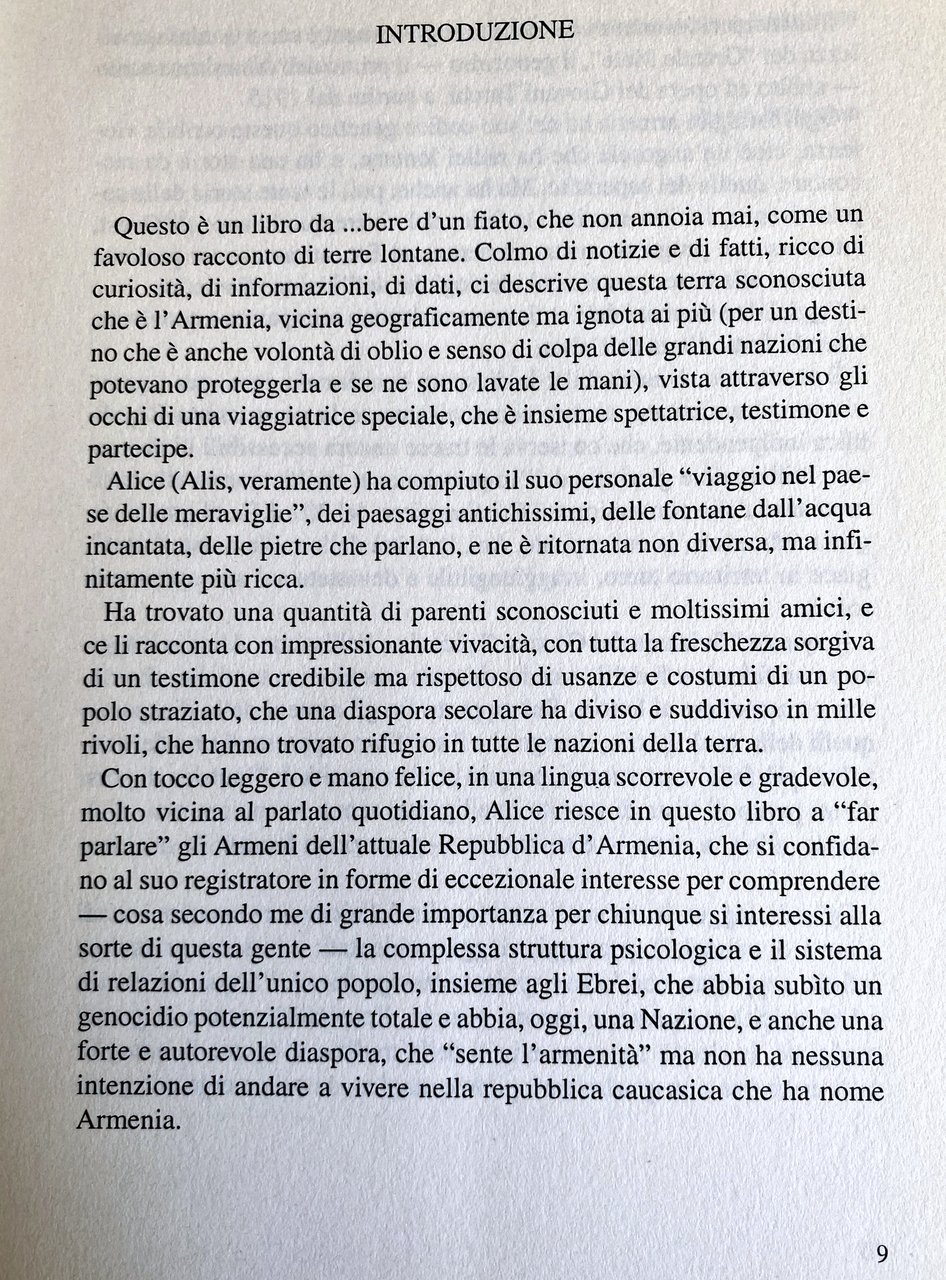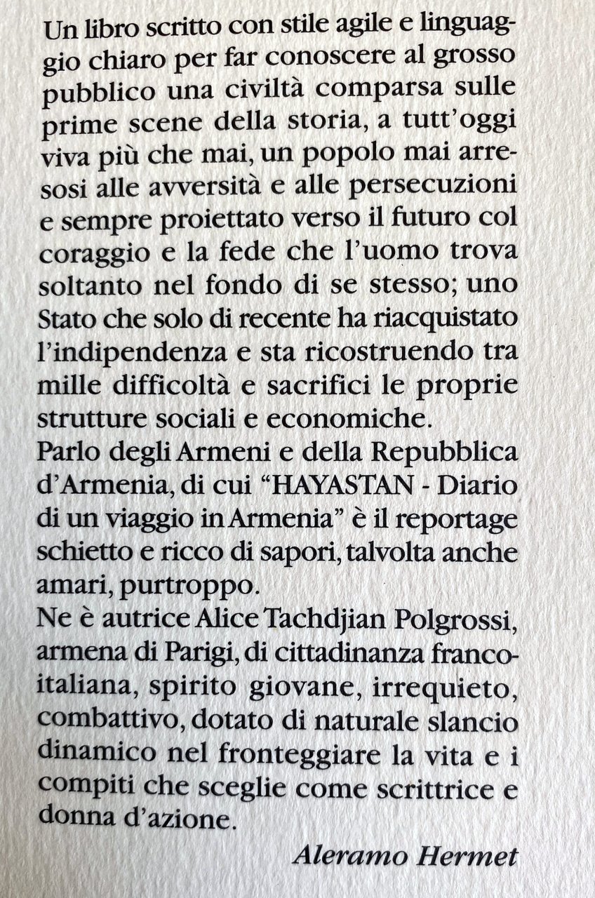 Un libro scritto con stile agile e linguaggio chiaro per far conoscere al grosso pubblico una civiltà comparsa sulle prime scene della storia, a tutt'oggi viva più che mai, un popolo mai arresosi alle avversità e alle persecuzioni e sempre proiettato verso il futuro col coraggio e la fede che l'uomo trova soltanto nel fondo di se stesso; uno Stato che solo di recente ha riacquistato l'indipendenza e sta ricostruendo tra mille difficoltà e sacrifici le proprie strutture sociali e economiche. Parlo degli Armeni e della Repubblica d'Armenia, di cui HAYASTAN: Diario di un viaggio in Armenia" è il reportage schietto e ricco di sapori, talvolta anche amari, purtroppo. Ne è autrice Alice Tachdjian Polgrossi, armena di Parigi, di cittadinanza franco-italiana, spirito giovane, irrequieto, combattivo, dotato di naturale slancio dinamico nel fronteggiare la vita e i compiti che sceglie come scrittrice e donna d'azione. Aleramo Hermet