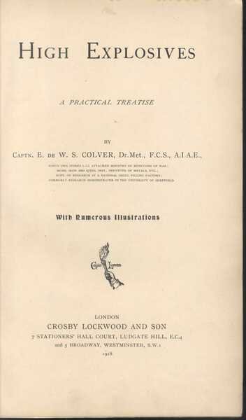 830pp VG/none First (only) edition. Presentation copy signed by the author to his assistant. Original editorial blue cloth with gilt lettering on spine, faded but still readable, cover worn with a couple of dents on the outer hinges with negligible loss, author’s presentation on endpaper, internally VG, overall a G-to-VG copy. With many b/w illustrations and diagrams throughout and tables, some of which large, folded. Massive work on high explosives, often referred to in literature, probably the most comprehensive and important book in English at that time on the subject.