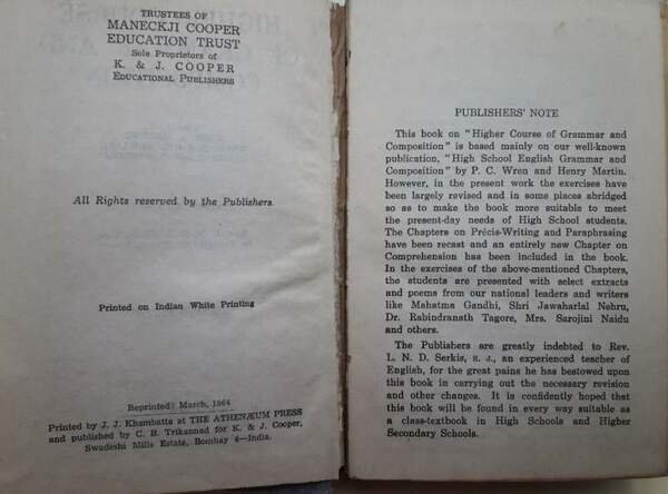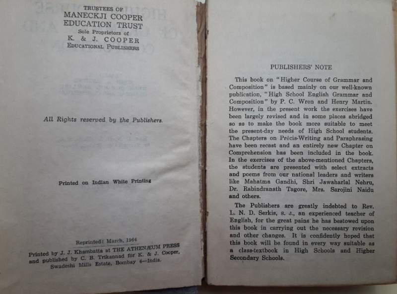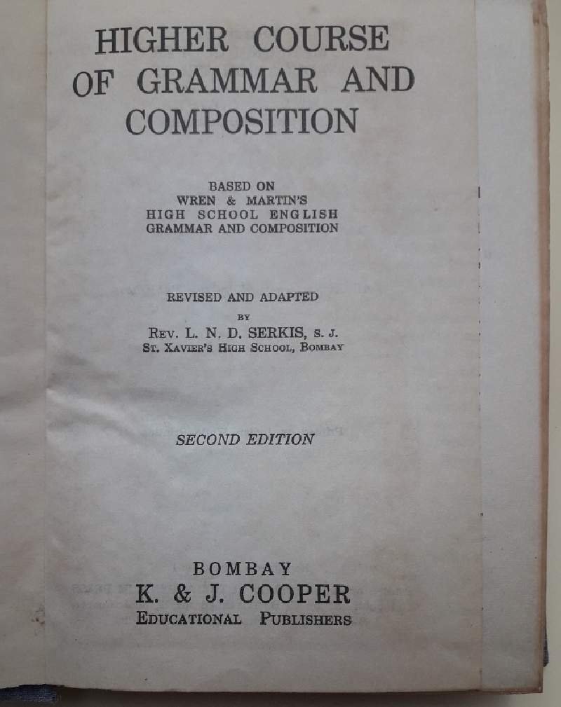 In 8', tela ed. pp. 568, based on Wren & Martin's high School English Grammar and Composition, second edition, revised and adapted by Rev. L.N.D.Serkis, s.j. St. Xavier's High School, Bombay. Dorso scolorito, abrasioni e segni d'uso alla cop.,fessure alla cerniera(foto), piccole gore e bruniture ai tagli, interno in buono stato, segni del tempo. ***Due to bureaucratic reasons, books dated over 70 years old cannot be immediately exported, please contact us before placing the order.***