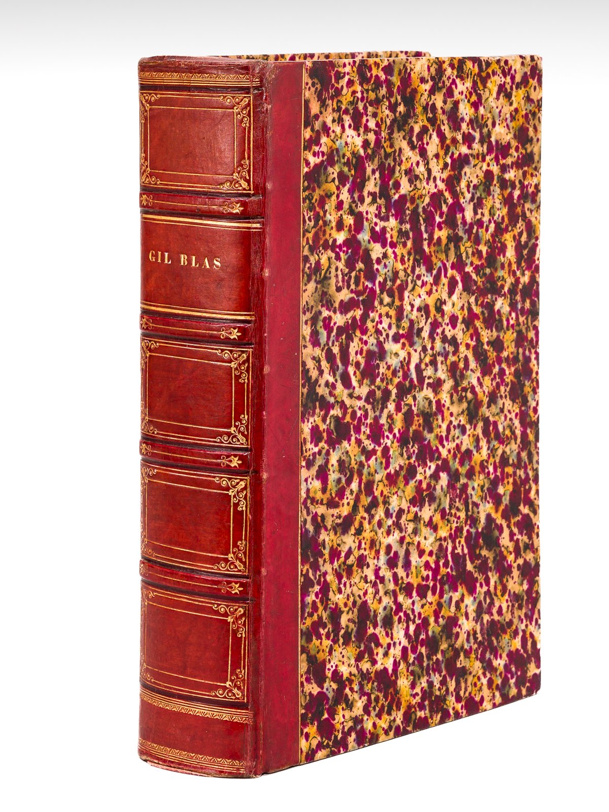 Vignettes par Jean Gigoux, 1 vol. grand et fort in-8 reliure de l'époque demi-veau rouge, premier plat de couverture conservé, dos à 4 nerfs orné, toutes tranches marbrées, filet doré en mors, Chez Paulin, Paris, 1835, 972 pp. avec le portait de Gil Blas tiré sur chine Rare et remarquable exemplaire complet du premier plat de la couverture d'origine en trois couleurs, et disposant de tous les caractéristiques des tous premiers tirages ; Brivois indique : "le texte est encadré d'un double filet ; dans quelques exemplaires (les premiers tirés peut-être), ce double filet est ondulé, au lieu d'être droit, dans les trois premiers feuillets seulement". Carteret est plus précis : "quelques exemplaires possèdent le faux-titre, le frontispice et le titre encadré d'un double filet en forme de grecque arrondie. C'est un essai sans aucun doute qui a été abandonné au moment du tirage, puisque les exemplaires sur chine qui sont de tout premier tirage ne les possèdent pas". La couverture conservée est bien conforme à la description donnée par Carteret : "la couverture de ton crème est imprimée sur fond légèrement bleuté dans deux encadrements rouges, avec texte imprimé en rouge et noir, bague au centre dans un chiffre gothique ; en bas la date de [ . ] 1836 en chiffres romains [.]". (Brivois, 256 ; Carteret, III, 382 ; Vicaire, V, 238). Bon état (petit frott. en coiffes, petite usure angulaire en couv. cons. et aux premiers ff., des rouss., très bon état par ailleurs, ex-libris Robert et Roland Thibaut) pour cet exemplaire de cet ouvrage, essentiel dans l'histoire du renouveau de la gravure sur bois à l'époque romantique, et qui connut un succès extraordinaire.