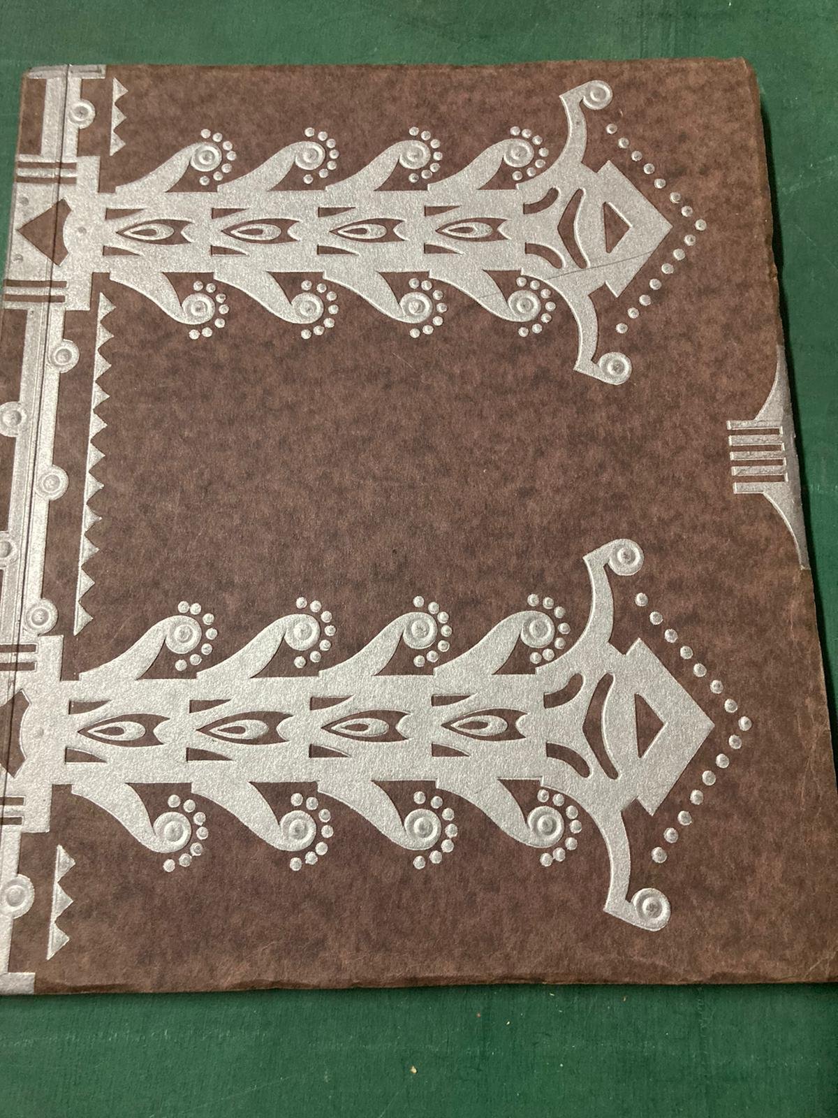 In-8° grande, pp. 48 nn., brossura originale marrone con ricchi fregi goffrati impressi in argento. Testo entro bordure figurate a colori variate ad ogni pagina, interamente illustrato a colori da Marcel Jeanjean (le illustrazioni sono incise dagli Anciens Établissements Gillot). 11 tavv. a colori ripiegate f.t. o applicate su cartoncino e protette da veline parlanti: riproduzione dei dipinti preistorici di Altamira, facsimile di un frammento del Libro dei Morti egizio, facsimile di pittogrammi di un codice azteco (un restauro e tracce di scotch a tale tavola ripiegata), facsimile della prima pagina di un manoscritto trecentesco delle Chroniques di Froissart, facsimile di una pagina della Bibbia delle 42 linee di Gutenberg conservata al British Museum, ritratto di Aritide Quillet, ritratto di Emile Henry, riproduzione di un acquerello di Jean Lefort ('Le Wagon'), riproduzione di un quadro di Langaskens, di un quadro di Garry, di una veduta di Taormina di Lacoste. Le tavv. f.t. sono impresse dall'Imprimerie des Dernières Nouvelles di Strasburgo e dall'Imprimerie Goffart di Bruxelles. Ottimo stato. Elegante storia della scrittura e del libro e, al contempo, della casa editrice e della libreria fondate da Aristide Quillet (Villiers-Adam, Val-d'Oise, 1880-ivi, 1955), cleebre soprattutto per le sue splendide pubblicazioni a carattere enciclopedico.