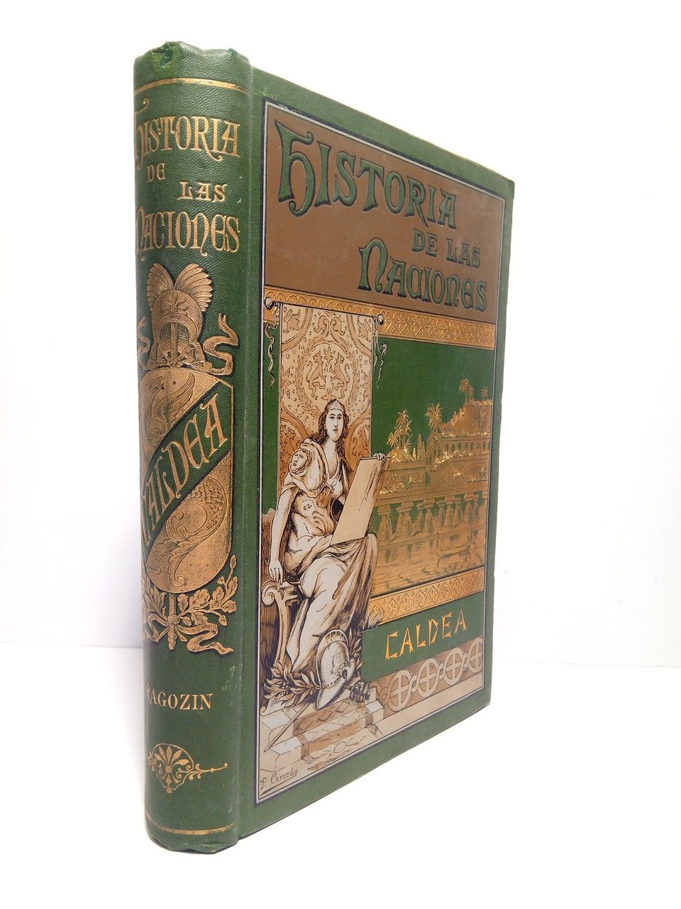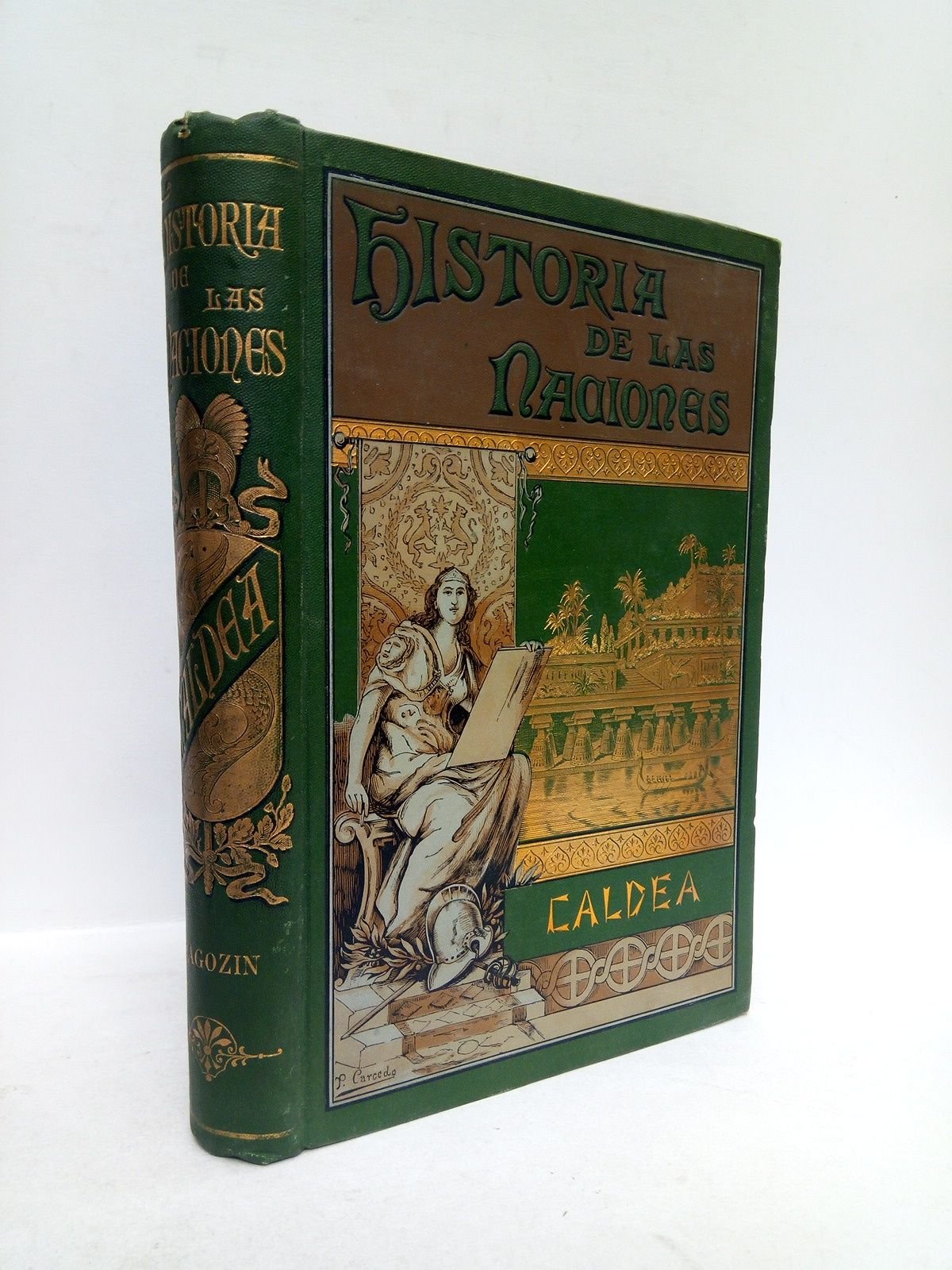 Madrid: El Progreso Editorial, 1889.- XXIII, 391 p., [2 h.], XV p.: Con 7 láminas grabadas en madera, 2 mapas plegados a doble hoja y profusión de ilustraciones intercaladas en el texto; 4º menor (21,3 x 14,6 cm); Plena Tela Ed., lomo liso con plancha dorada y tapas ilustradas con planchas en negro y oro sobre fondo verde, firmada por P. Carcedo.- (Col. Historia de las Naciones).* Mínimos desperfectos en la cabeza del lomo. ANTIGUAS CULTURAS DE ASIA MENOR Y CARTAGO