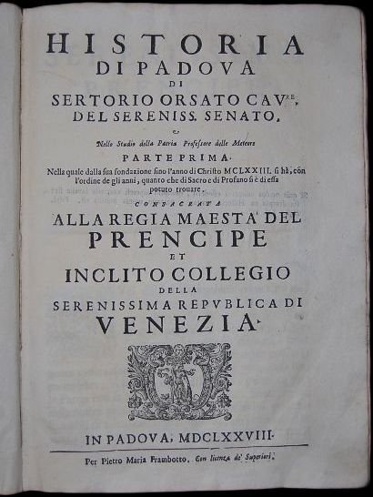 Historia di Padova nella quale dalla sua fondazione sino l’anno di Christo MCLXXIII. si ha, con l’ordine de gli anni, quanto che di sacro e di Profano si è di essa potuto trovare. Parte prima [unica pubblicata.Completo]. | Libri antichi e moderni | Orsato Sertorio