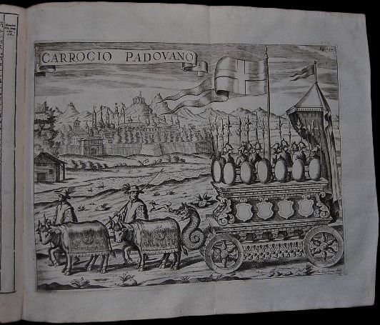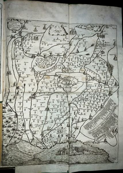 In 4° (32,2×23 cm); (16 la prima carta bianca, poi occhietto e frontespizio), 338 (ma 334), (26) pp. e 5 c. di tav. fuori testo (antiporta figurata, ritratto dell’autore, monumento a Tito Livio, grande carta più volte ripiegata del territorio padovano e sempre ripiegata, la tavola con il Carrocio Padovano). Completo. Legatura coeva in piena pergamena rigida con dorso a tre nervi e titolo manoscritto al dorso. Antica scritta seicentesca al piatto anteriore “Doppio Compl.”. Testo entro cornice xilografica. Piccolo timbretto di antica appartenenza privata all’occhietto. Antica nota manoscritta di possesso alla prima carta bianca che identifica l’esemplare come appartenuto al celebre bibliofilo ed erudito originario di Adria ma a lungo canonico del Duomo di Treviso, Giuseppe Antonio Bocchi. Il volume, un duplicato, venne evidentemente venduto da Bocchi per integrare con altra opera la sua imponente collezione che sarebbe stata poi, alla sua morte, donata alla città di Treviso. Antico timbro ottocentesco al margine basso bianco dell’antiporta che identifica l’esemplare come appartenuto all’Antica Libreria Occhi di Luigi fu Gennaro Faval. Strappo senza perdita di carta ed ininfluente anticamente restaurato alla grande carta dell’”Agri Patavini” e nel complesso esemplare in ottime condizioni di conservazione dalla carta pulita e frusciante. Tagli spruzzati in rosso. Numerose incisioni nel testo, magnifica quella più volte ripiegata del “Carrocio Padovano”. Testatine, finalini ed iniziali xilografici. Prima edizione e prima ed unica parte edita di questa basilare storia di Padova e del suo territorio, compilata dal celebre poeta, storico, filosofo ed archeologo padovano, Orsato Sertorio 1617-1678. L’autore fu elevato al rango di Cavaliere di San Marco nel 1652 sotto il dogado di Francesco Molin con privilegio dell’ 8 novembre dal Senato in premio alla sua opera “Monumenta Patavina, studio collecta, digesta, explicata suisque iconibus expressa” edita in Padova nel 1652. Pubblicherà nel 1669 il primo volume de “I Marmi Eruditi” integrato, dopo la sua morte, con un secondo volume a cura del nipote Giannantonio Orsato, monaco cassinense e nel 1679 la prima parte della sua monumentale storia di Padova, qui presentata. Nel 1670 fu nominato Professore “delle Metore” (Meteorologia) all’ Università di Padova. A lui si deve anche una nota orazione al Doge Giovanni I Corner. E’ nominato dal Senato della Serenissima nel privilegio quale “Di Padova. Nobile, Conte, Erudito e Storico”. La sua storia di Padova e del suo territorio, è considerata come una delle migliori mai scritte, oltre a rappresentare una fonte di grande importanza per la storia archeologica del territorio padovano. Rif. Bibl.: Brunet, IV, 240; Vinciana, 911; Buzzanca, 554: “L’opera è la sintesi monumentale dell’applicazione erudita dell’Orsato su Padova”.