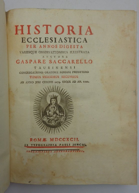 Un volume (20,5x27 cm) di 421 pagine. Titolo in rosso e nero. Gora alle prime e ultime pagine. In lingua latina. Questo volume, il ventitreesimo della monumentale «Historia» del Saccarello (in 26 volumi, peraltro incompiuta) comprende i pontificati di Gregorio VII e di Urbano II, la lotta tra papato e impero, i concili con papi e antipapi, Matilde di Canossa, la prima crociata. Legatura coeva in tutta pergamena rigida, tassello di titolo al dorso, tagli blu. Gora al margine inferiore e al piatto posteriore.