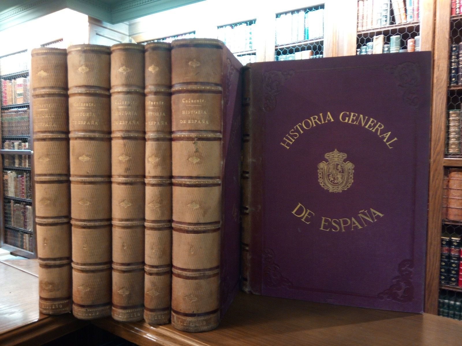 Barcelona: Montaner y Simón, Editores, 1877-1882.- 6 VOLS. ([2 h.], XLVI,547 p.; [2 h.], 661 p., [1 h.]; [2 h.], 593 p., [1 h.]; [2 h.], 458 p., [1 h.]; [2 h.], 621 p., [1 h.]; [2 h.], 871 p., [1 h.]): Bellamente ilustrado con preciosas láminas cromolitográficas a todo color, retratos de los reyes de España en láminas grabadas al cobre por Masson, mapas históricos de España a doble página e ilustraciones numismáticas en negro a plena página con las monedas de cada época, abriendo el tomo 1º con el retrato de D. Modesto Lafuente finamente grabado al cobre; Folio mayor (35 x 25,5 cm); Excelente impresión a dos columnas sobre buen papel; Enc. Editorial en Media Piel de Rusia (grabada en seco a rombos diminutos), lomo con hierros en seco y oro, tapas con planchas en seco y oro, todo en color granate.* En el Tomo 2º hay dos láminas de más y en el Tomo 3º hay una lámina de más. En el Tomo 5º viene explicada esta errata. El Tomo 4º falto de una lámina, concretamente "Armas del Siglo XVIII". Las encuadernaciones con pequeños roces que han sido restaurados. Dicho esto, que es preceptivo, podemos asegurar que la obra se encuentra en un estado excelente, ya que estos libros grandes y pesados suelen acabar casi siempre descuajaringados. Aparte de ser una magnífica historia, contiene importante información numismática que en su tiempo fue muy valorada. Modesto Lafuente fue el arquitecto de la historia nacional española, el que vertebró el modo de organizar la historia de España concebida como una nación cuya existencia tenía un arraigo en un territorio peninsular que marcaba la personalidad como pueblo. Hasta Lafuente sólo existía una historia de los reyes, realizada por el padre Mariana al filo del siglo XVII, llena de mitos, fábulas y versiones interesadas de los conflictos dinásticos. Lafuente limpió la historia de todo esto, creando las bases para la moderna historiografía hispánica. HISTORIAS GENERALES DE ESPAÑA Y ENSAYOS SOBRE SU HISTORIA EN GENERAL