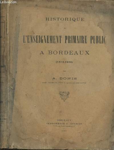 Historique de l'Enseignement Primaire Public à Bordeaux (1414 - 1910). Sommaire : Etat de l'enseignement primaire public aux diverses époques de l'histoire et sous différents gouvernements - Les premières écoles. Petites écoles ou écoles abécédaires - etc | Libri antichi e moderni | Donis A.