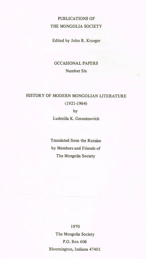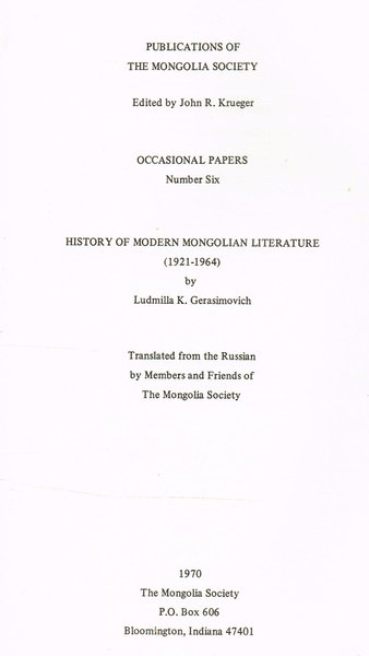 HISTORY OF MODERN MONGOLIAN LITERATURE 1921 1964