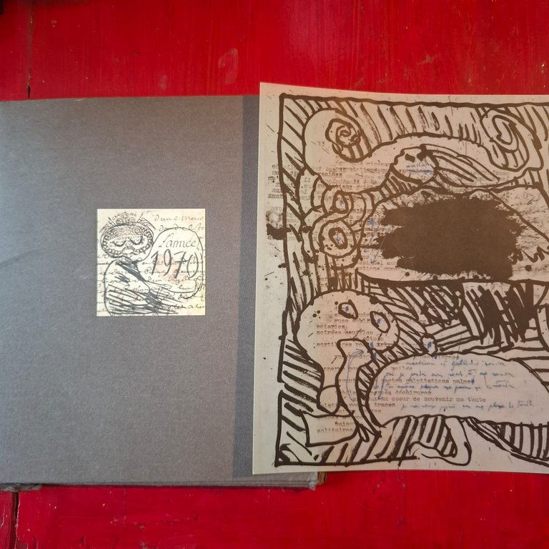Prima edizione, a cura della Direzione Relazioni Culturali Disegno Industriale e Pubblicità Ing. C. Olivetti & C, gennaio 1970, testo francese, cartella cartonata morbida, formato 23x27, contenente fogli sciolti 1) 12 disegni di Pierre Alechinsky su 12 dattiloscritti di Michell Butor, 2) 12 poesie di Michell Butor per 12 disegni di Pierre Alechinsky ( Agenda Olivetti 1970), allegate 12 prove di stampa con annotazioni, ottime condizioni - 53849
