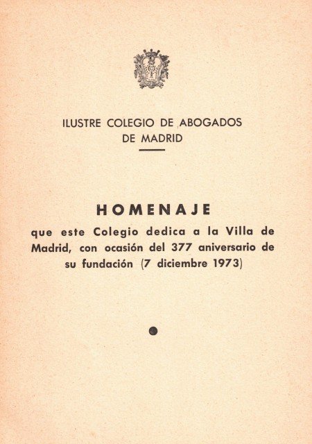 HOMENAJE que este Colegio dedica a la Villa de Madrid, con ocasión del 377 aniversario de su fundación (7 diciembre 1973) Discurso de Julio de Ramón Laca y contestación del Alcalde Miguel Angel Garci | Libri antichi e moderni | Ilustre Colegio De Abogados De Madrid