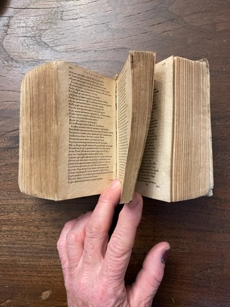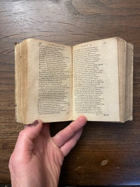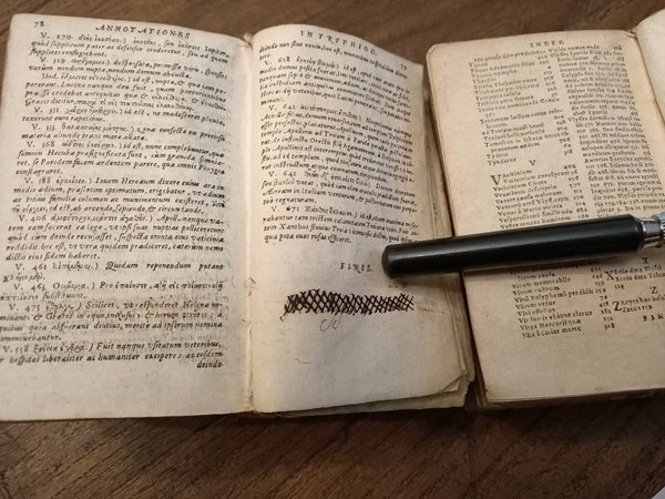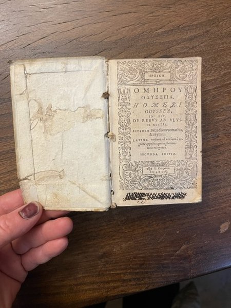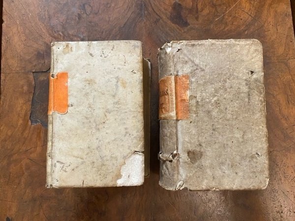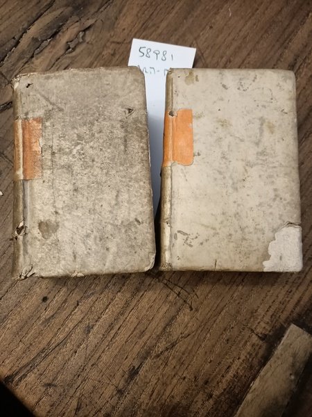 2 volumi assieme. Il primo: [10], 921, [23], 79, [1] p.; 12 cm. Leg. in tutta pergamena morbida con piccole mancanze al dorso, usurata.Titoli manoscritti al dorso su antica etichetta e sul taglio superiore. Frontespizio con cornice tipografica. Sul frontespizio è scritta la data 1509, ma in realtà è 1590. Data ed editore sono scritti con caratteri greci. Piccola mancanza all'angolo della pergamena della copertina del secondo volume. Firme di possesso al risguardo e alla base del frontespizio anticamente cancellate con inchiostro che ha parzialmente corroso la carta. Mancanza all'angolo del risguardo anteriore del primo volume, che è scollato. Carta ingiallita. Nome abraso all'interno della copertina sia anteriore che posteriore del secondo volume, antiche note a penna al risguardo posteriore del primo volume. Francesco Porto, umanista greco cretese di origine vicentina, insegnò a Ferrara e a Modena prima di rifugiarsi a Ginevra a causa della sua adesione alla fede riformata - Il secondo: [16], 839, [9] p.; 12 cm. Leg. in tutta pergamena morbida usurata con piccola mancanza ad un angolo del piatto anteriore, etichetta con titolo al dorso, titolo manoscritto al taglio superiore. Frontespizio con cornice tipografica. Firma di possesso alla base del frontespizio anticamente cancellata con inchiostro che ha parzialmente corroso la carta. Tra p. 133 e p. 142 sottile traccia di tarlo che tocca la parte stampata. Carta ingiallita in entrambi i volumi. Si vendono insieme