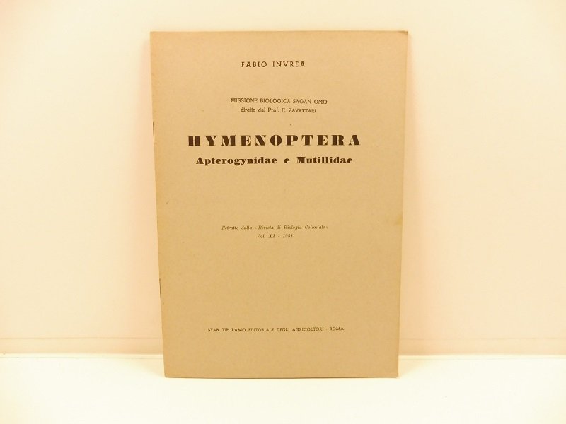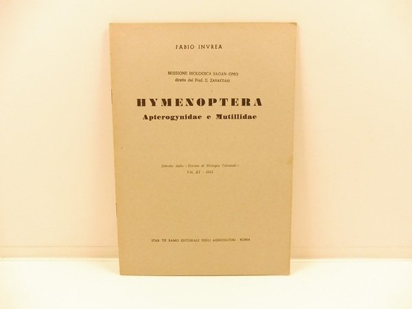 In 8, da pagina 37 a pagina 56 con illustrazioni n.t. Brossura editoriale. Catalogo degli apteroginidi e mutillidi raccolti durante la missione biologica Sagan-Omo diretta da Zavattari.