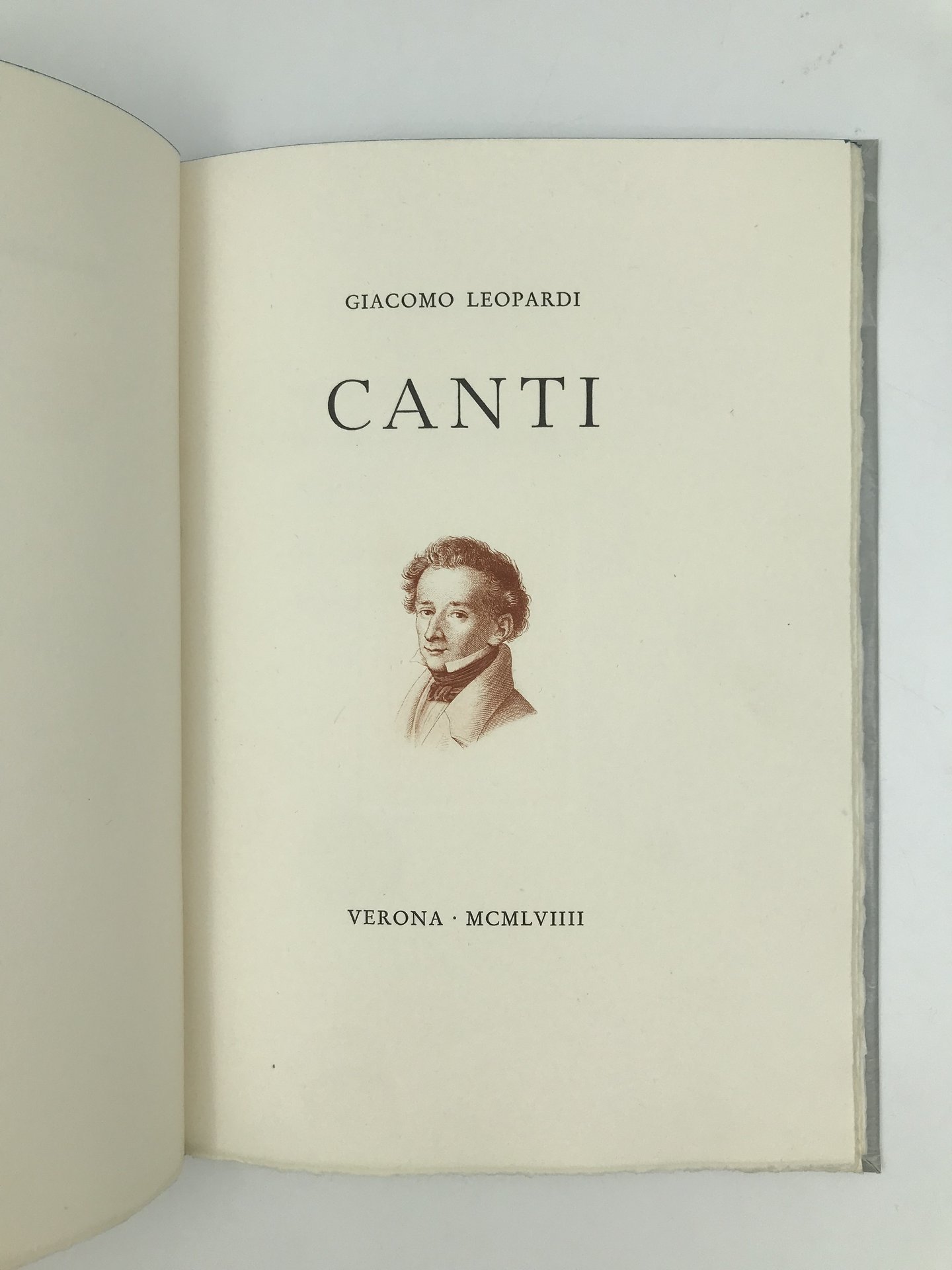 In 4to (272x185 mm). 31, [1] pp. Piccolo ritratto di Leopardi al frontespizio. Brossura editoriale azzurra, taglio superiore azzurro, gli altri in barbe; custodia cartonata azzurra. Copia perfetta.