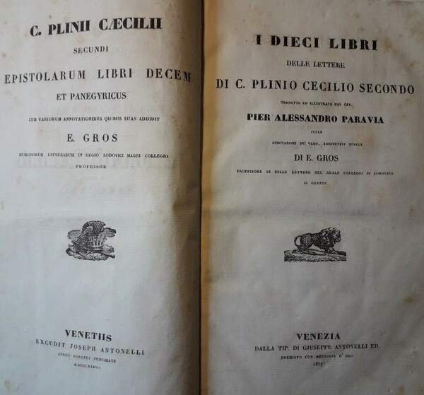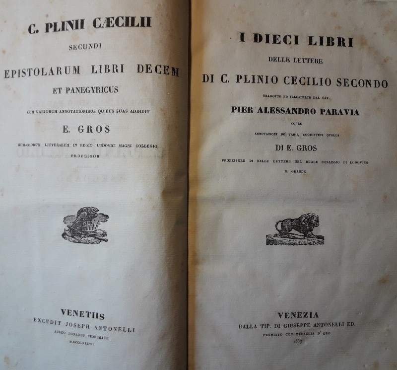 I DIECI LIBRI DELLE LETTERE DI C.PLINIO CECILIO SECONDO TRADOTTE ED ILLUSTRATE DAL CAV. PIER ALESSANDRO PARAVIA(1837) | Libri antichi e moderni | Plinio