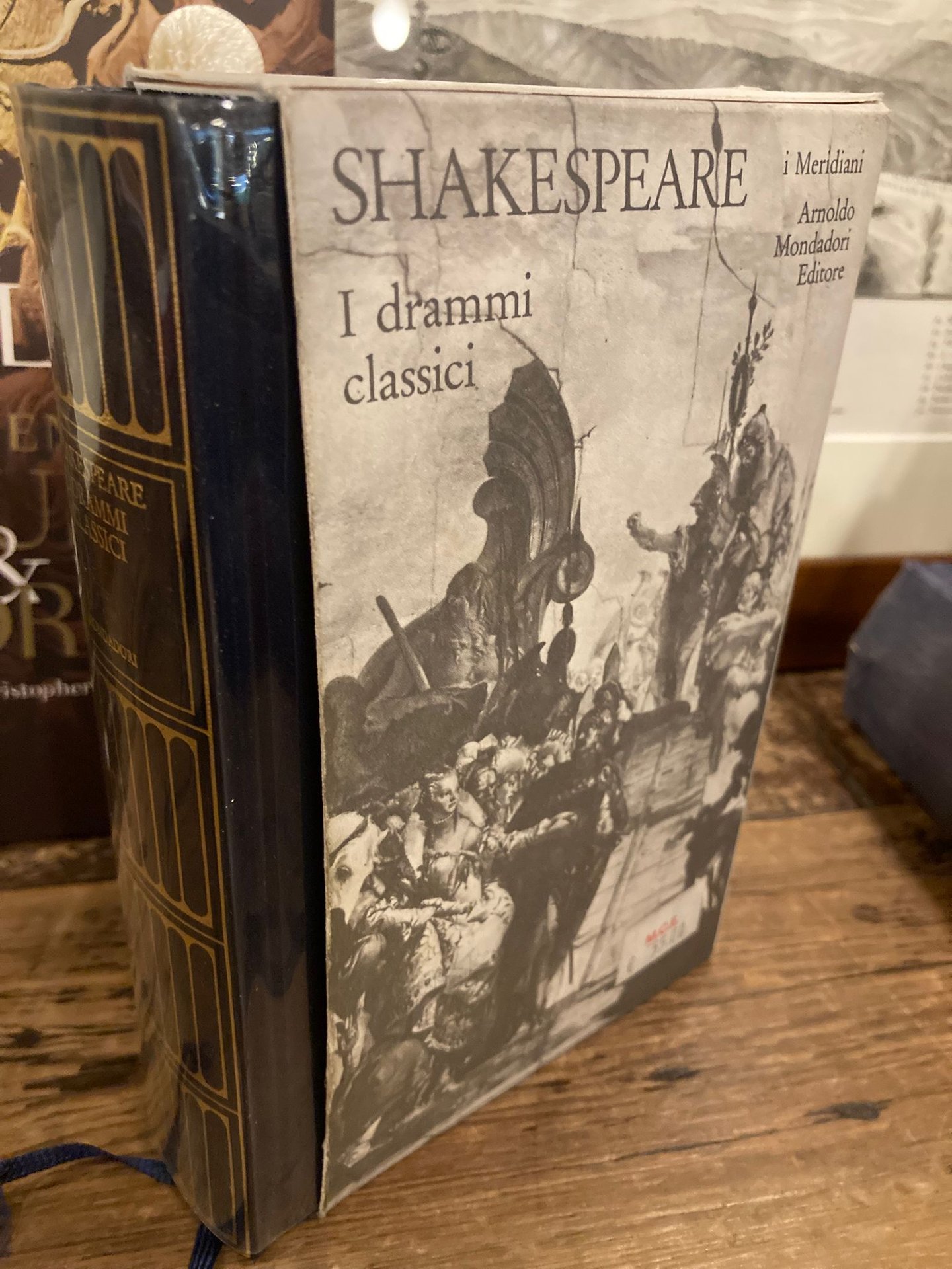 In-16° (17.5x11 cm), pp XLIII (1) 1315 (9), balacron editoriale con titolo e impressioni in oro al dorso, acetato protettivo, custodia cartonata illustrata, segnapagine tessuto. Stampato su carta India. Teatro completo di WilliamShakespeare, 5. Minimi difetti all'acetato ma ottimo esemplare. Edizione di riferimento per cura filologica e apparato paratestuale dei drammi di ambientazione classica del Bardo di Albione: Tito Andronico; Giulio Cesare; Antonio e Cleopatra; Coriolano; Timone d' Atene. Testo originale con traduzione a fronte in lingua italiana.