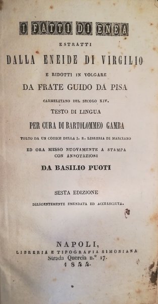 I fatti di Enea estratti dall?eneide di Virgilio da Frate Guido da Pisa (sec. XIV). | Libri antichi e moderni | B. Gamba - B. Puoti, ,B. Gamba - B. Puoti