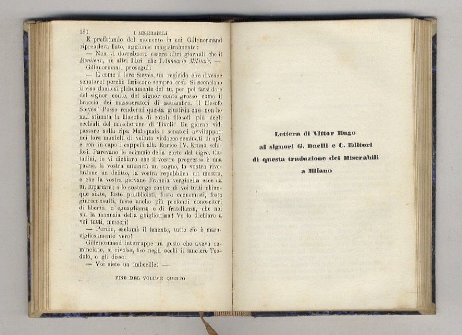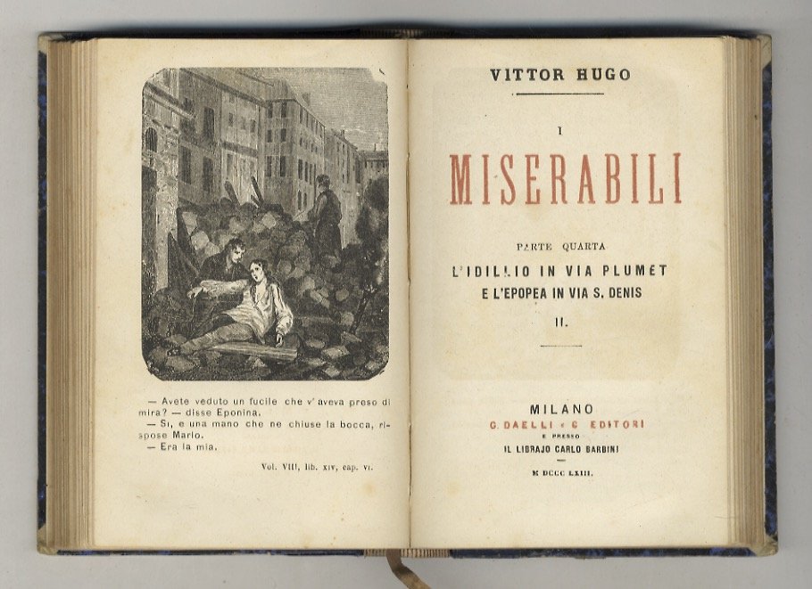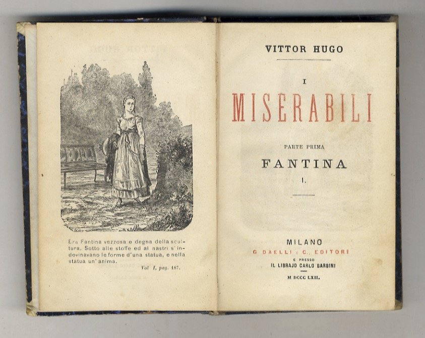 Milano, G. Daelli e C. e presso il libraio Carlo Barbini, 1862 - 1863, volumi 10 legati in 5, in-16, legatura di poco successiva in mezza pelle, titolo e filetti in oro ai dorsi, pp. 212 - 228 - 209, [1] - 190 - 180, 7, [1] - 180 - 266 - 236 - 225, [3] - 191, [1]. Con frontespizi in rosso e nero e 10 antiporte incise. Prima traduzione italiana. A conferma di questo comprende anche la pubblicazione d'una lettera di Hugo all'editore Daelli a proposito di questa edizione. Bell'esemplare.