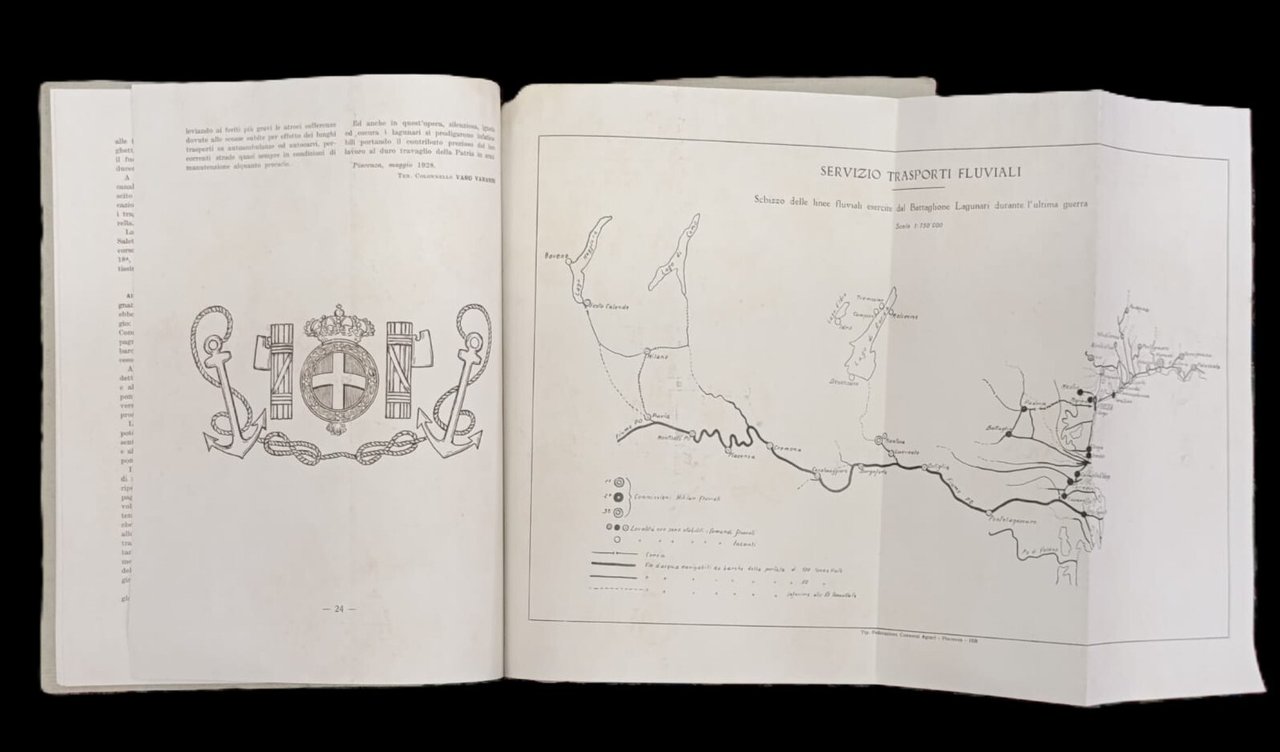 Al fondo del libro una cartina ripiegata contenente un prezioso schizzo delle linee fluviali esercite dalo Battaglione Lagunari durante l'ultima guerra Discrete condizioni compatibilmente con i quasi cent'anni di età. L'angolo alto a sinistra è un po' smangiato (vedi foto).