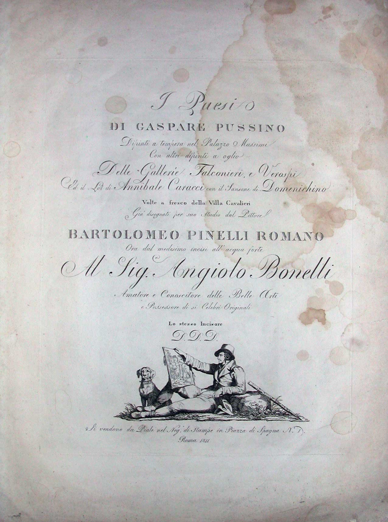 I paesi di Gaspare Pussino, dipinti a tempera nel Palazzo Massimi, con altri dipinti a oglio delle Gallerie Falconieri, e Verospi, ed il Lot di Annibale Caracci, con il Sansone di Domenichino volte a fresco della Villa Cavalieri già disegnati per suo Studio dal Pittore Bartolomeo Pinelli Romano ora del medesimo incisi all'acque forte. Al Sig. Angiolo Bonelli [.].