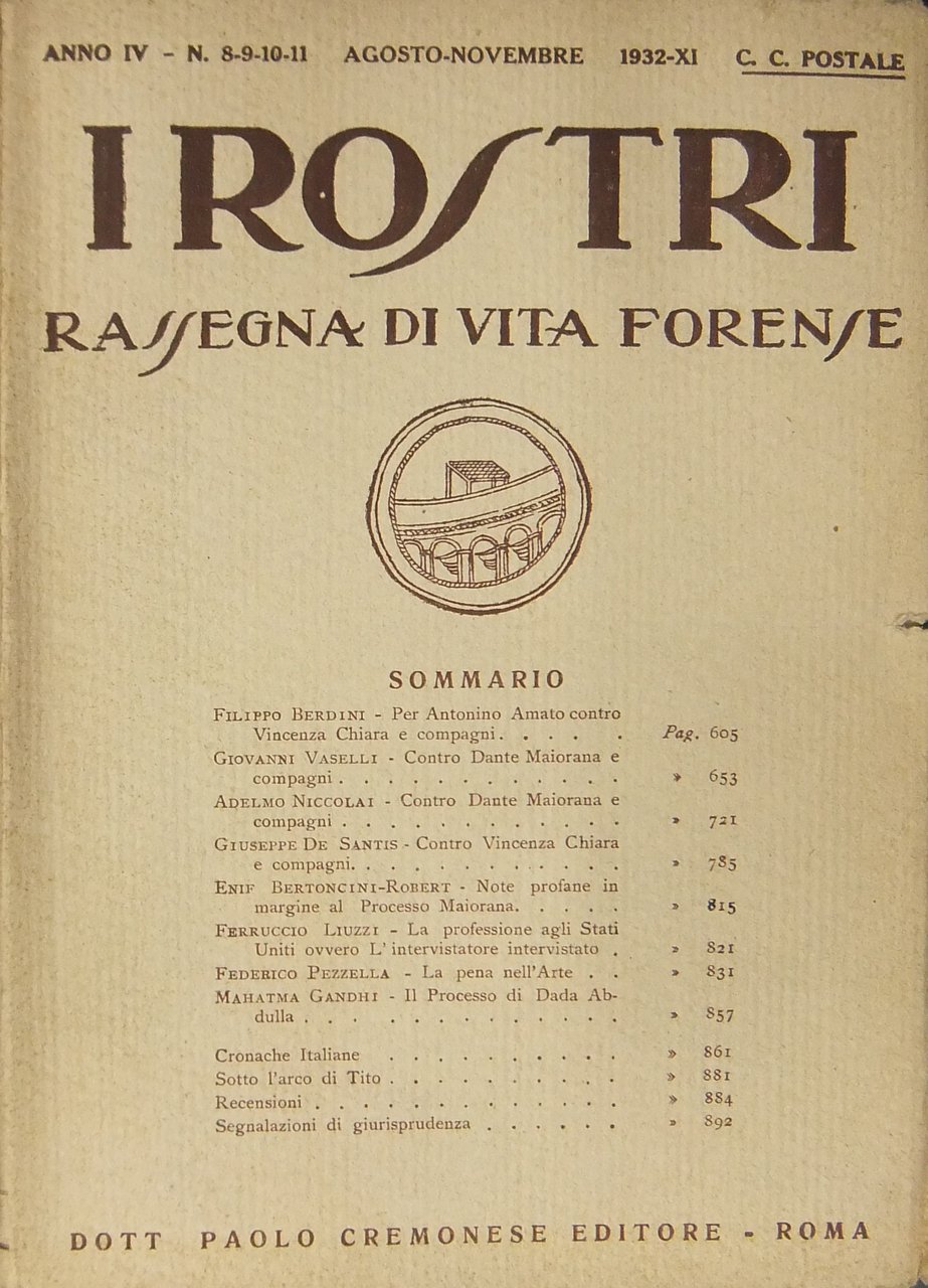 I Rostri. Rassegna di vita forense. Anno IV - N. 8-9-10-11 Agosto-Novembre 1932 | Libri antichi e moderni | De Sanctis G. - Vaselli G. Et Alii