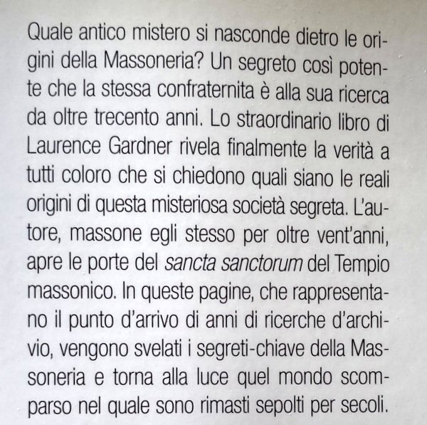 Quale antico mistero si nasconde dietro le origini della Massoneria? Un segreto così potente che la stessa confraternita è alla sua ricerca da oltre trecento anni, Questo libro di Laurence Gardner rivela finalmente la verità a tutti coloro che si chiedono quali siano le reali origini di questa misteriosa società segreta, L'autore, massone egli stesso per oltre vent'anni, apre le porte del sancta sanctorum del tempio massonico, In queste pagine, che rappresentano il punto d'arrivo di anni di ricerche d'archivio, vengono svelati i segreti-chiave della Massoneria e torna alla luce quel mondo scomparso nel quale sono rimasti sepolti per secoli.