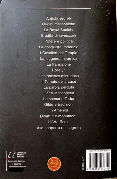 Soggetti: Storia, Religione, Filosofia, Mistero, Esoterismo, Occultismo, Poteri occulti, Potere, Logge massoniche, Loggia, Massoneria, Inghilterra, Regno Unito, Francia, Sacro Santo Graal, Spiritualità, Sette segrete, Documenti storici, Confraternite, Misteri, Sangue, Enigmi, Re, Codice Da Vinci, Cavalieri, Templari, Spie, Servizi Segreti, Agenti, Cabala, Numerologia, Simbolismo, Iniziazione, Rituali, Magia, Bibbia, Paganesimo, Cristianesimo, Chiesa, Rosa-Croce, Arca dell'Alleanza, Pietra filosofale, Conoscenza, Riti, Masonic Zodiacs, Dan Brown, Da Vinci Code, The Lost Symbol, Knights Templars, George Washington, Spies, Secret agents, Clandestine cabals, Ark of the Covenant, Philosopher's Stone, Antichi Segreti, Origini Massoniche, Royal Society, Eredità, Invenzioni, Potere E Politica, Conquista Imperiale, Tempio, Leggenda Hiramica, Transizione, Rosslyn, Scienza Misteriosa, Luce, Parola Perduta, Anti-massoneria, Scenario Tudor, Gilde, Tradizioni, America, Dibattiti, Monumenti, Arte Reale, Libri illustrati, Libri Vintage Fuori catalogo, Iconografia, Immagini, Fotografie d'epoca, Dipinti, Pittura, Strumenti, Arti liberali, Costituzione, Cena di Emmaus, Obelisco, Alessandria d'Egitto, Jacopo Carucci, Biagio D'Antonio da Firenze, Simboli massonici, Cerchio, Croce, Londra, Thomas Sprat, Rotolo Kirkwall, Abbazia di Chiaravalle, Cardinali, Edoardo, principe di Galles, Tavole, Gradi, Luxor, Gerusalemme, Ebraismo, Giudaismo, Cattedrali, Compasso, Bartolo Nazari, Unterberger, Genesi, Ninive, Babilonia, Diluvio Universale, Monarchie, Reali, Nobiltà, Bibliografia, Cronologia, Riferimento, Classici, Windsor, Wren, Mosè, Lavoratori, Corporazioni, Notre Dame, Scozia, Isaac Newton, Noè, Michelangelo, Alchimia, Anderson, Boyle, Bacone, Fludd, Carlo II, Gresham College, Grande Oriente, Sollevazione Giacobita, Giacobiti, History, Religion, Philosophy, Mystery, Esotericism, Occultism, Occult powers, Power, Masonic Lodges, Lodge, Freemasonry, England, United Kingdom, France, Holy Grail, Spirituality, Secret sects, Historical documents, Brotherhoods, Mysteries, Blood, Enigmas, Kings, Kabbalah, Numerology, Symbolism, Initiation, Rituals, Magic, Bible, Paganism, Christianity, Church, Rosicrucian, Knowledge, Rites, Masonic Zodiacs, Ancient Secrets, Masonic Origins, Legacy, Inventions, Power And Politics, Imperial Conquest, Temple, Hiramic Legend, Transition, Mysterious Science, Light, Lost Word, Anti-Freemasonry, Guilds, Traditions, Debates, Monuments, Picture Books, Out of print Books, Iconography, Pictures, Vintage Photographs, Paintings, Painting, Tools, Liberal arts, Constitution, Supper, Obelisk, Alexandria of Egypt, Florence, Masonic symbols, Circle, Cross, London, Scroll, Abbeys, Cardinals, Edward, Prince of Wales, Tables, Degrees, Jerusalem, Judaism, Judaism, Cathedrals, Compasses, Genesis, Nineveh, Babylon, Flood, Monarchies, Royalty, Nobility, Bibliography, History, Reference, Classics, Moses, Workers, Corporations, Scotland, Noah, Michelangelo, Alchemy, Bacon, Great East, Uprising, Jacobites